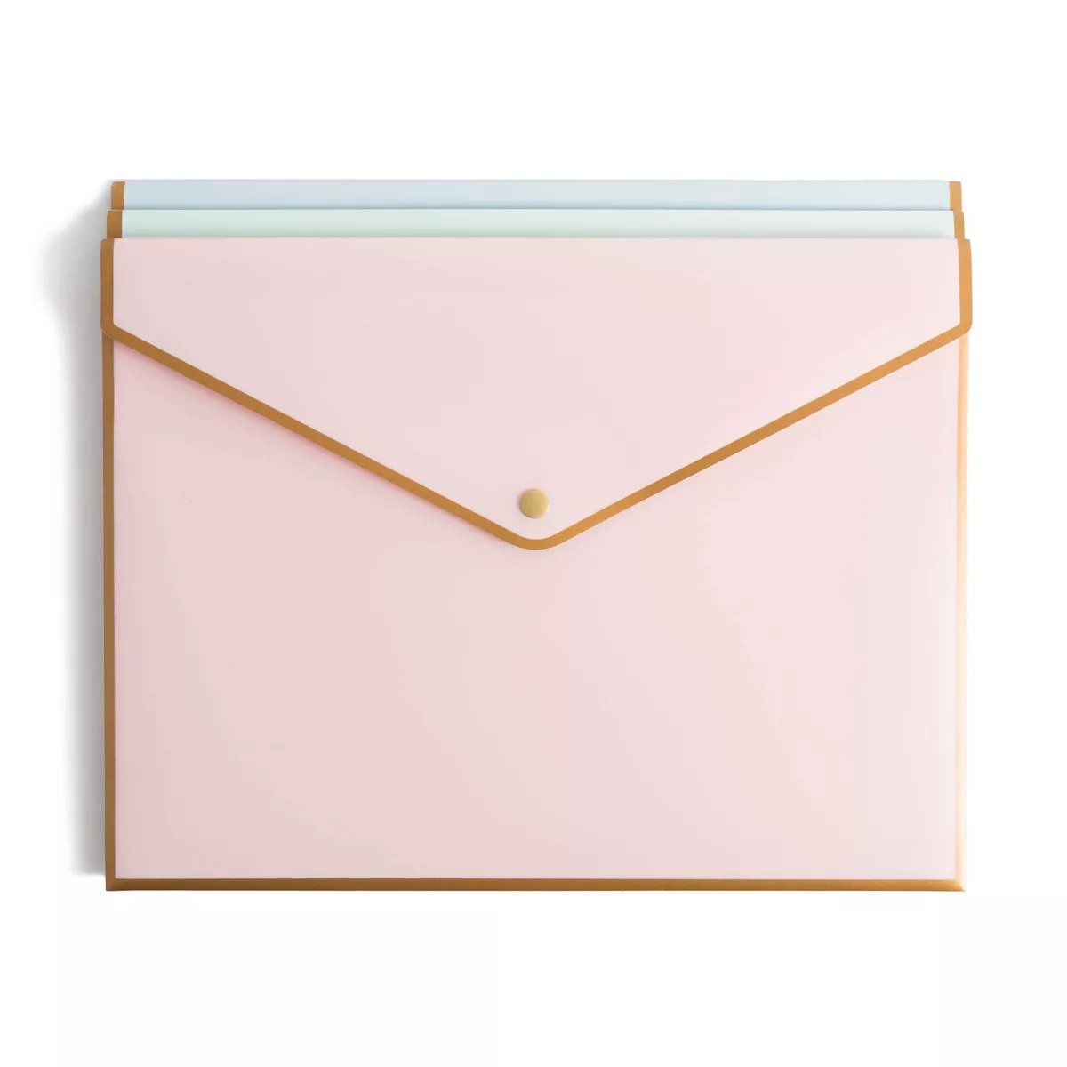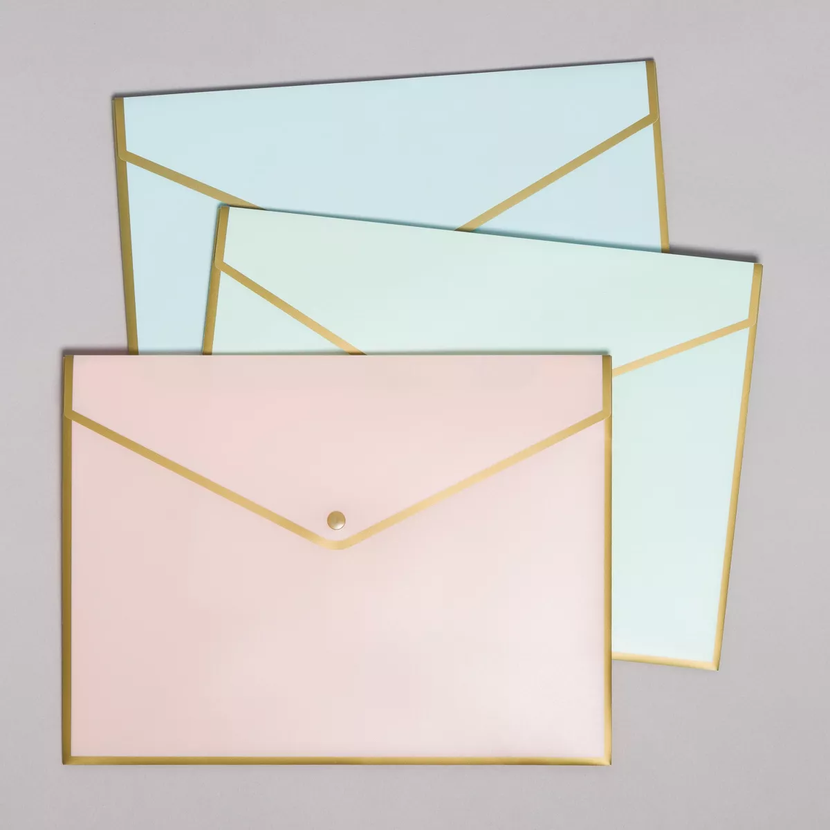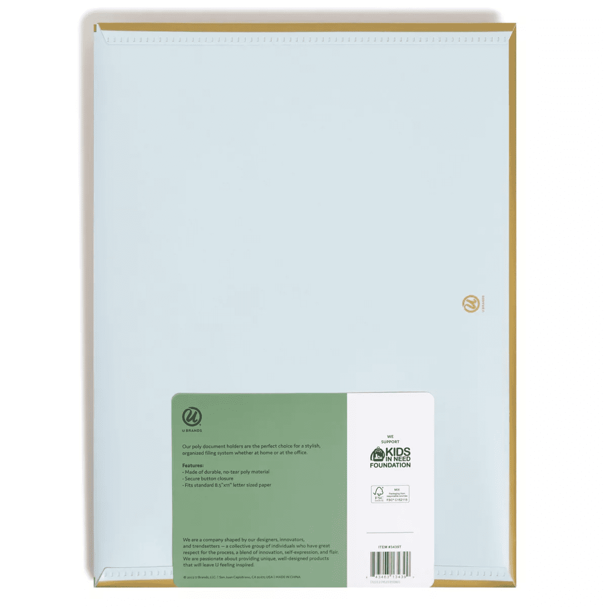 U Brands® 3ct Polyurethane Document Holders are the perfect combination of style and function. Features three assorted classic pastel colors with gold borders and button closures for a convenient way to protect those important documents without sacrificing style. These easy to open and close document holders bring ease to any at home or office organization by keeping documents secure, making staying organized fun and easy.