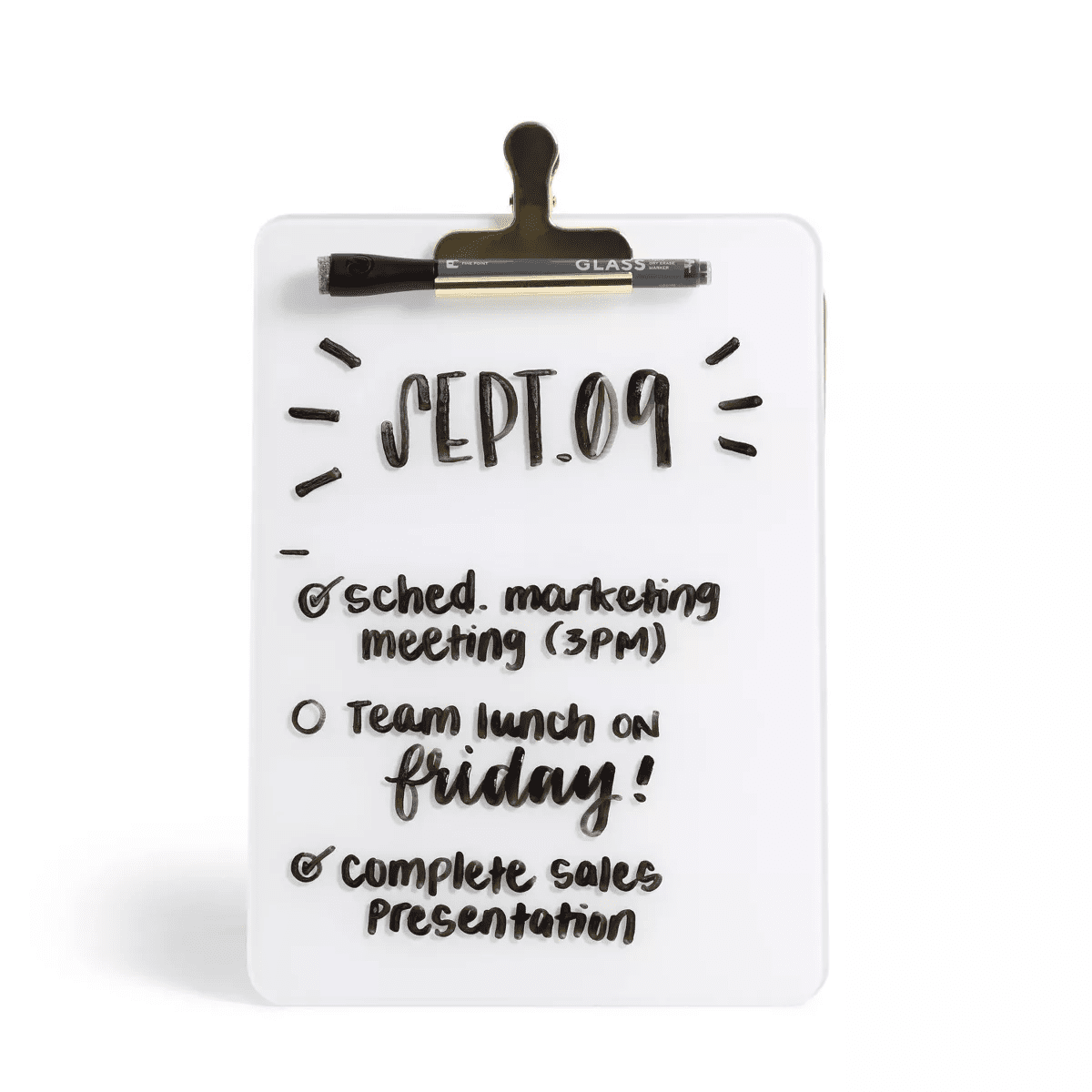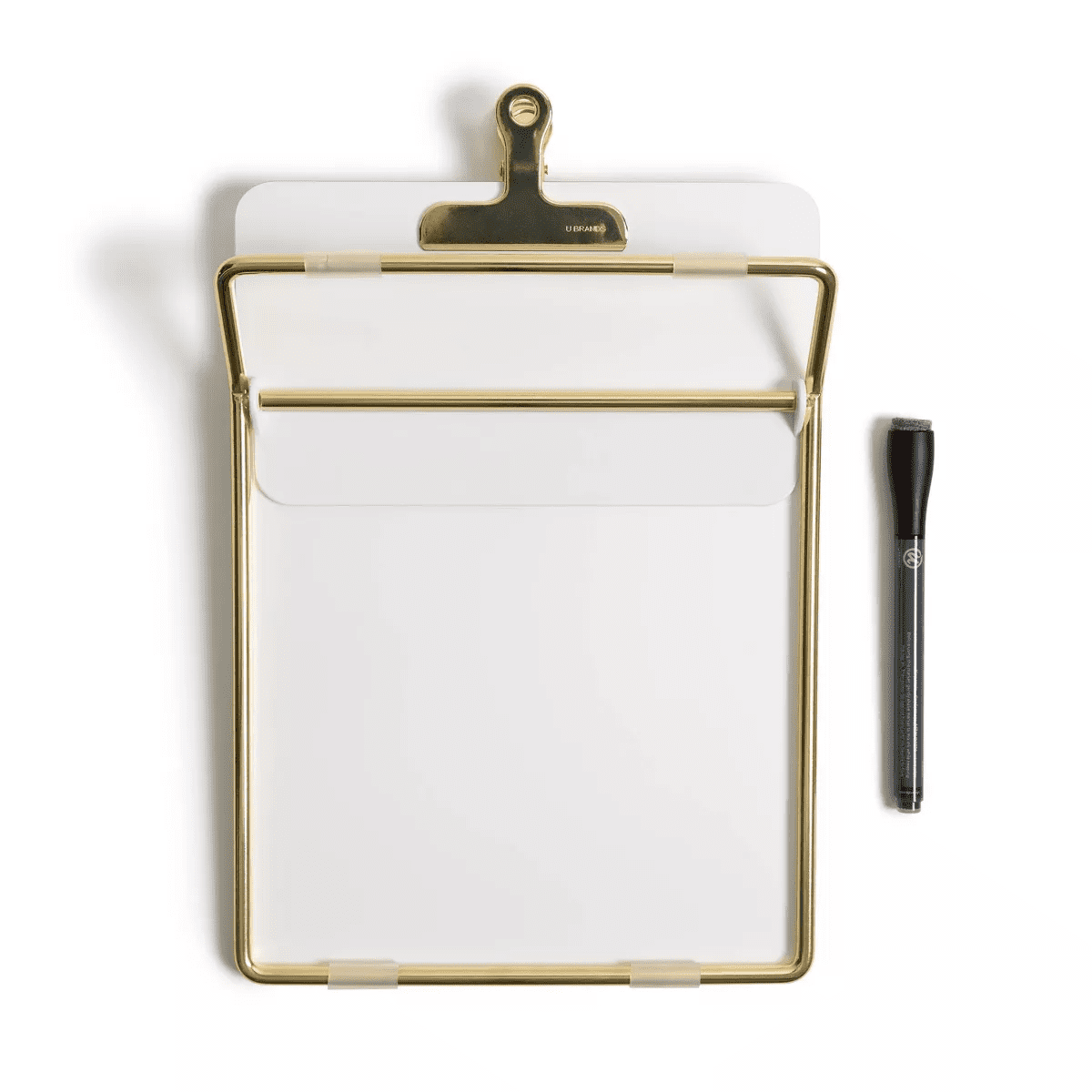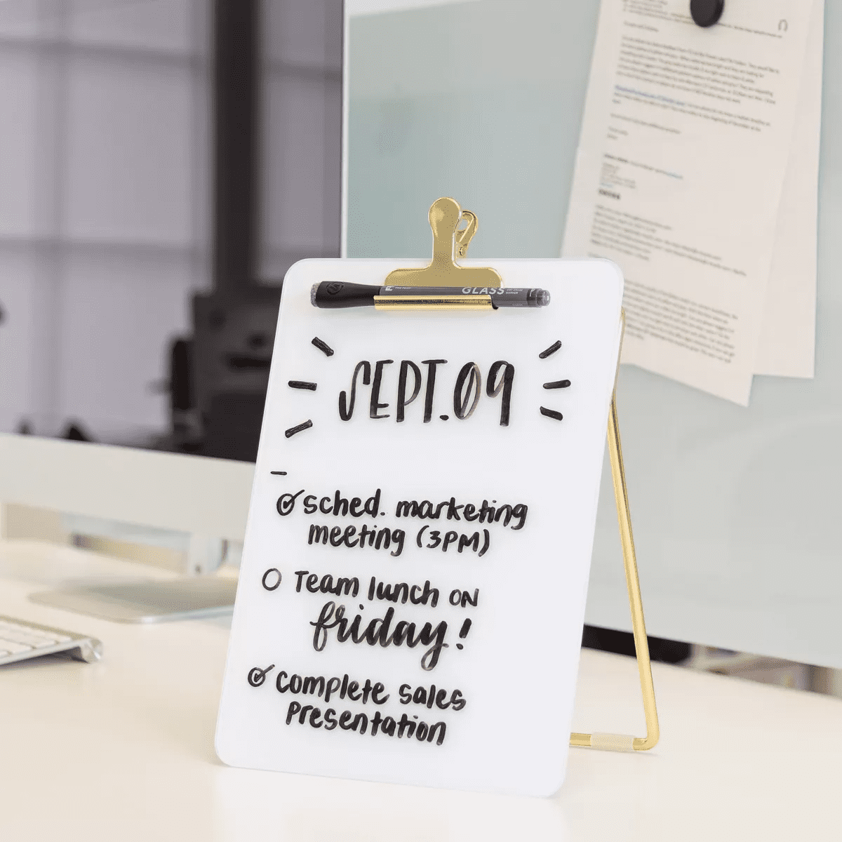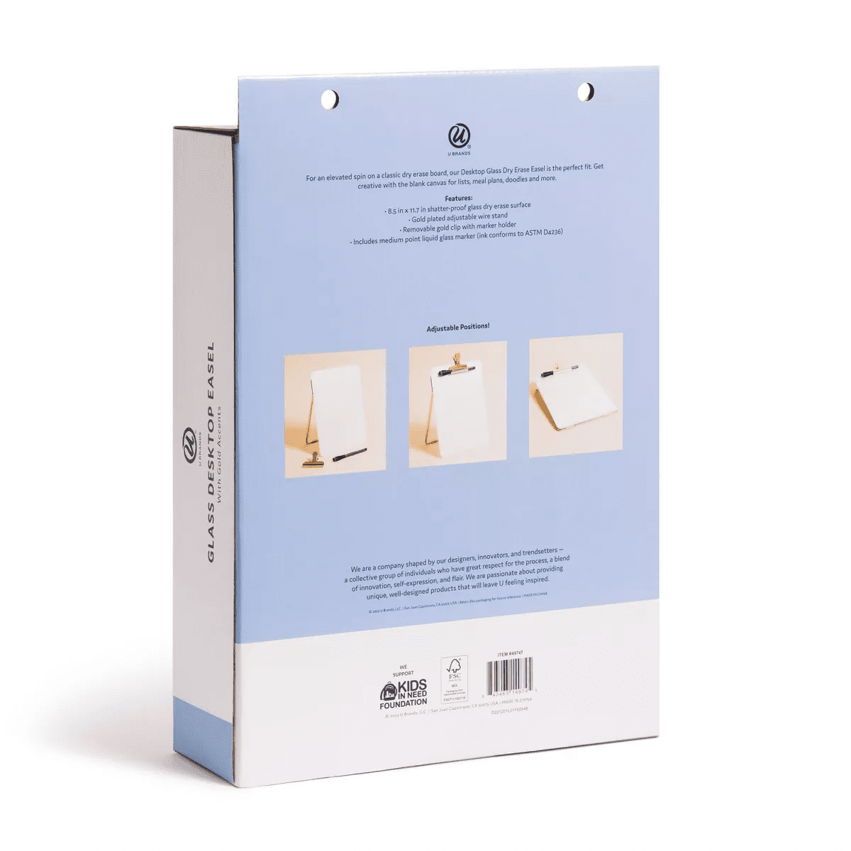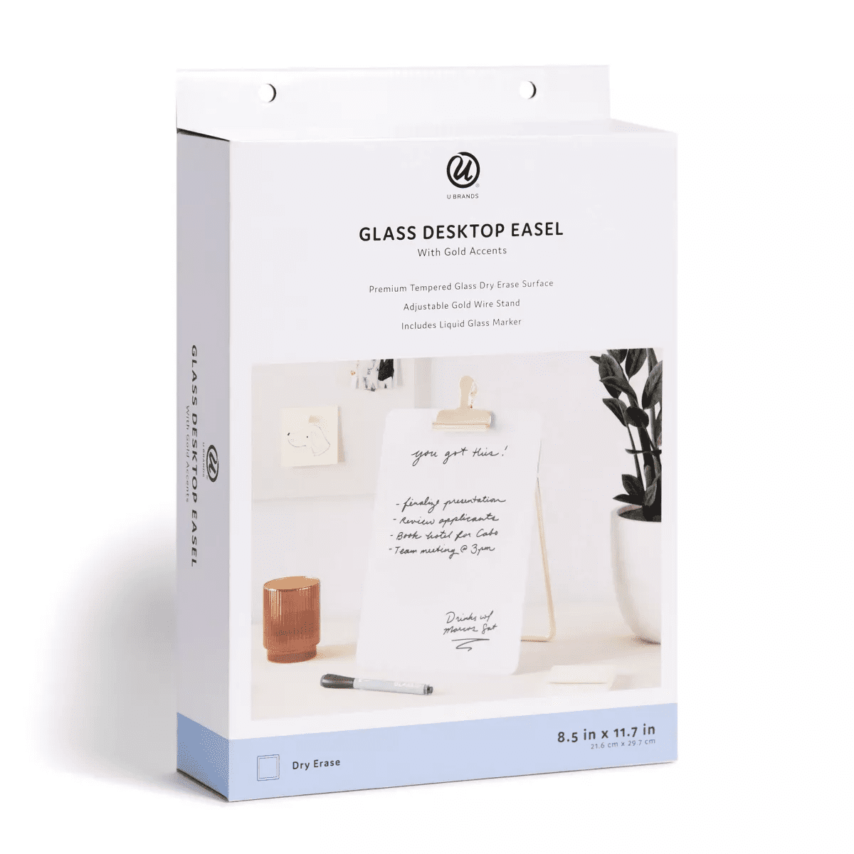 Never lose track of your notes or to-dos with this Glass Desktop Easel with Gold Accents from U Brands®. Featuring an 8.5″ x 11″ shatter-proof glass dry erase surface, the easel can stand upright or be collapsed into a clipboard. The removable gold clip can hold papers or notes, and perfectly fits the included liquid glass dry erase marker. The premium glass surface resists staining and ghosting to ensure a clean slate day after day.