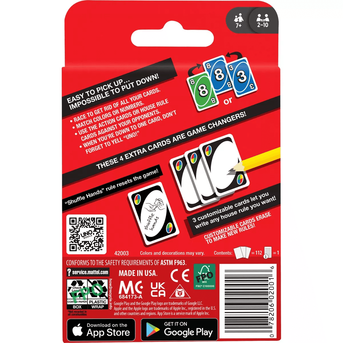 UNO is the classic and beloved card game that’s easy to pick up and impossible to put down! Players take turns matching a card in their hand with the current card shown on top of the deck either by color or number. Special action cards deliver game-changing moments as they each perform a function to help you defeat your opponents. These include Skips, Reverses, Draw Twos, color-changing Wild and Draw Four Wild cards. You’ll find 25 of each color (red, green, blue, and yellow), plus the eight Wild cards, inside the 108-card deck. If you can’t make a match, you must draw from the central pile! And when you’re down to one card, don’t forget to shout “UNO!” The first player to rid themselves of all the cards in their hand before their opponents wins. It’s Fast Fun for Everyone! Includes 108 cards and instructions. Colors and decorations may vary.