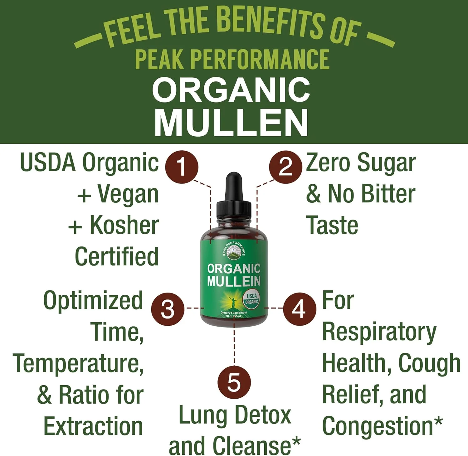 - Say goodbye to ineffective mullein pills and capsules. With Peak Performance USDA Certified Organic Mullein Leaf Liquid Drops, you get a high bioavailability tincture supplement, from the highest quality ingredients we could find. We created a balanced, absorbable formula with optimized time, temperature, and ratio for extraction.
