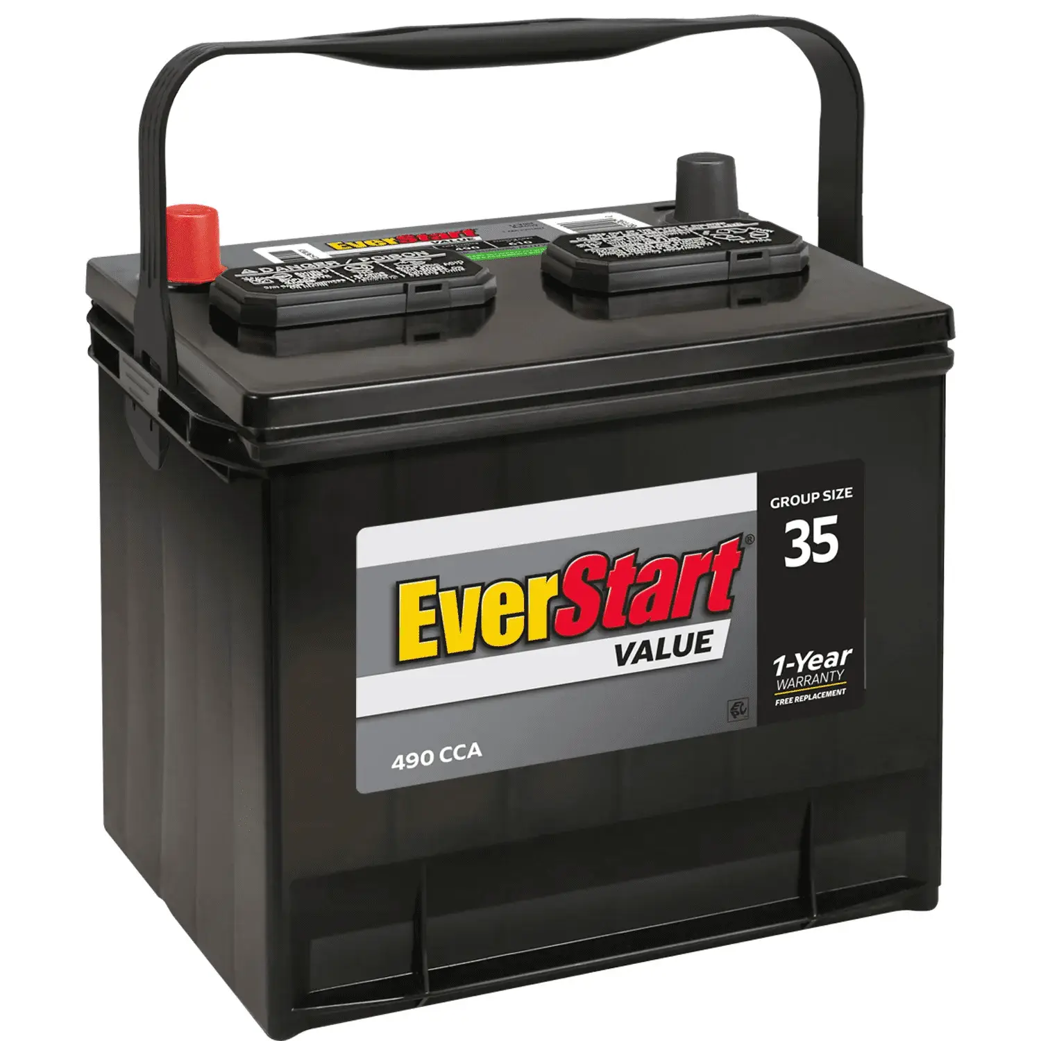 Get your car started and running again with the installation of the EverStart Value Automotive Battery, Group Size 35. It offers dependable starting power at a value price, including a one year warranty. Compatible with a range of makes, models and years, it has conveniently located top posts for easily connecting positive and negative terminals. This 12 volt lead acid automotive battery delivers 490 cold cranking amps with 80 minutes of reserve capacity for reliable starts in all weather. This battery is maintenance free and can be conveniently installed and tested at a local Walmart Auto Care Center.