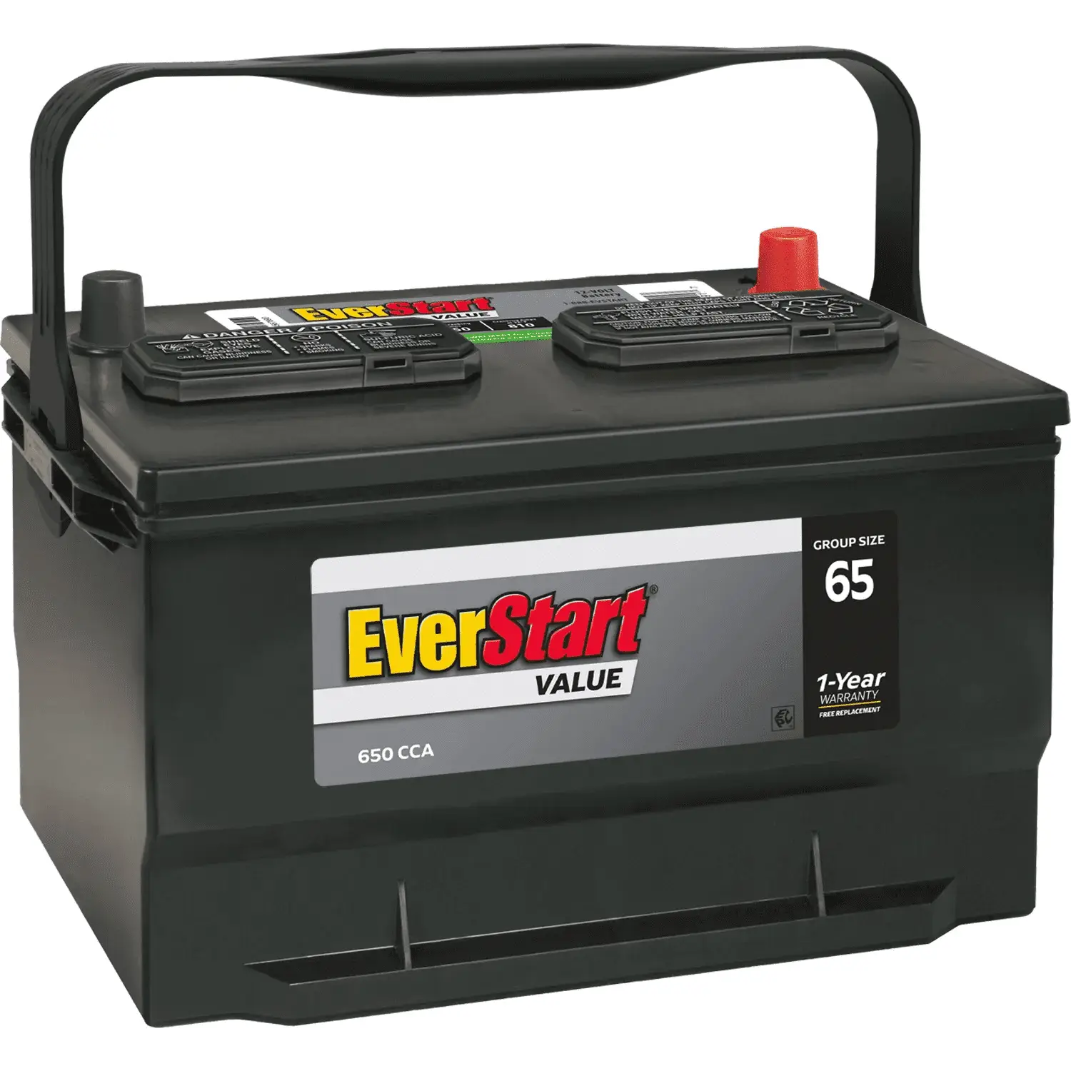 Get your car started and running again with the installation of the EverStart Value Automotive Battery, Group Size 65. It offers dependable starting power at a value price, including a one year warranty. Compatible with a range of makes, models and years, it has conveniently located top posts for easily connecting positive and negative terminals. This 12 volt lead acid automotive battery delivers 650 cold cranking amps with 80 minutes of reserve capacity for reliable starts in all weather. This battery is maintenance free and can be conveniently installed and tested at a local Walmart Auto Care Center.