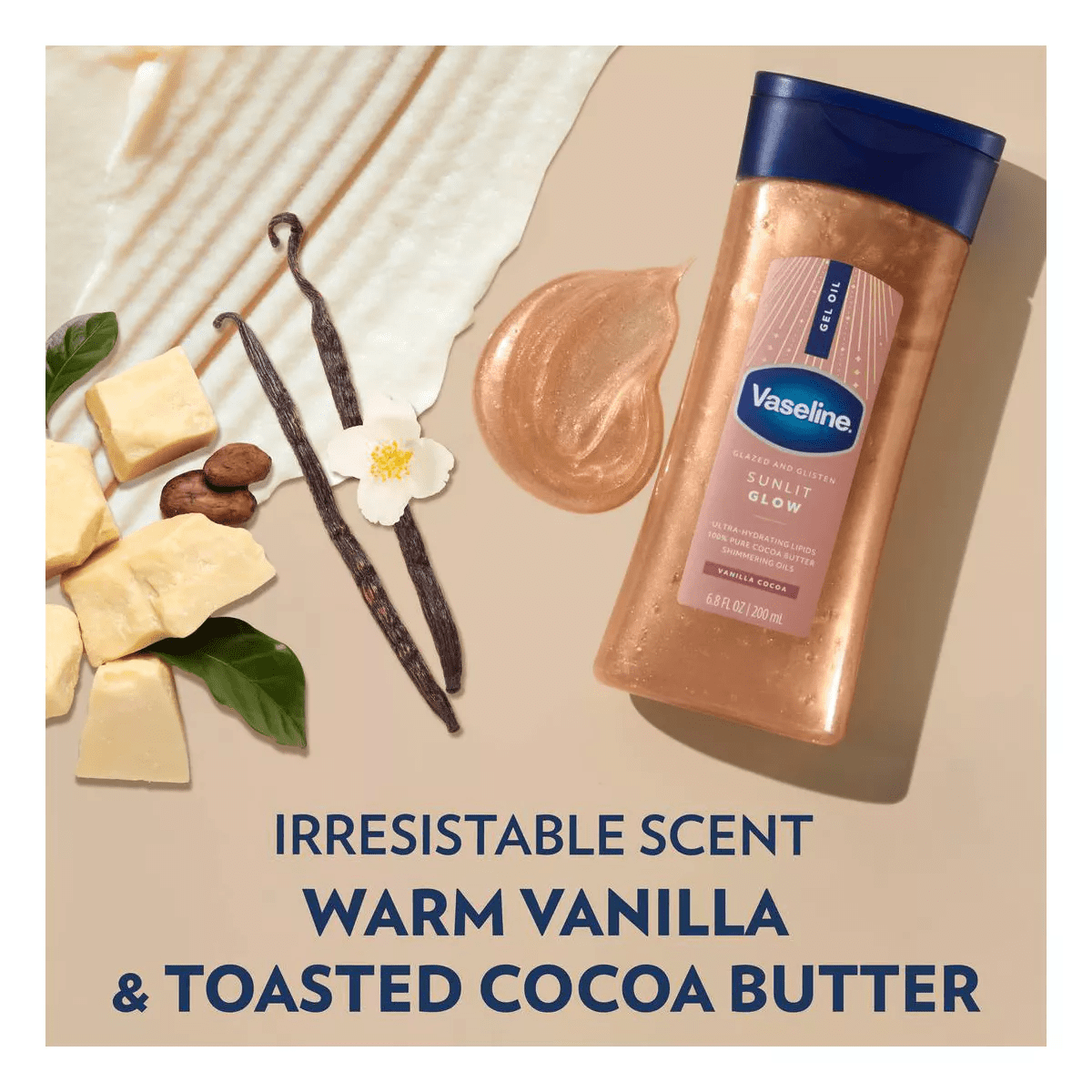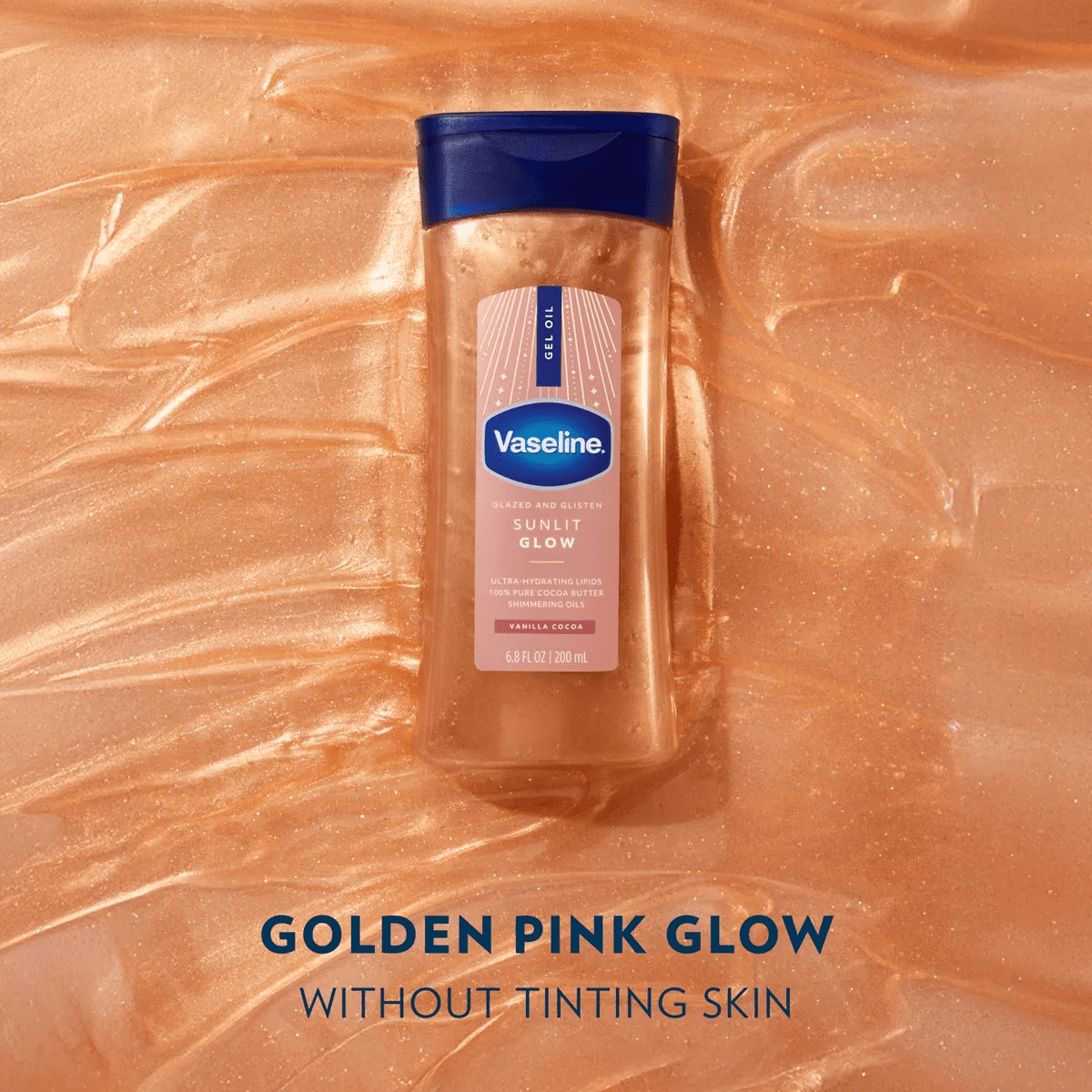 Glow like sunlight on skin with our new Vaseline Glazed & Glisten Shimmering Body Gel Oil —a luxurious, silky oil gel formula that melts into skin, leaving a light-catching, peachy champagne shimmer for a soft, sunlit glow—without tinting the skin. Transport your senses with an addictive fragrance blend of warm vanilla and toasted cocoa butter — enveloping skin in a glow and scent that lingers like soft daylight and sunshine on skin. It’s summer in a bottle. This lightweight, shimmering body oil glides on with a sheer, peachy glaze and dewy, glossy finish that absorbs quickly—no sticky residue, just transfer-resistant glow that catches the light. Powered by beauty from skin science, this body oil for dry skin is infused with skin-loving ingredients like ultra-hydrating lipids and 100% pure cocoa butter to help strengthen the skin barrier and lock in moisture—revealing visibly smooth, glowing skin that stays hydrated and looks as good as it feels. Designed with light-reflecting shimmer, this peachy golden-pink glow flatters all skin tones and skin types—delivering a lit-from-within radiance that enhances your natural beauty and leaves you glowing with confidence. Massage oil onto shoulders, collarbones, arms, and legs for radiant skin that catches light wherever the day takes you. Skincare meets self-care when you layer body oil after shower or bath with your favorite body lotion to lock in hydration, glow, and scent that lasts. From sunlit mornings and poolside lounging to desk-to-dusk days and soothing self-care evenings, this is your new glow-to essential from AM to PM.