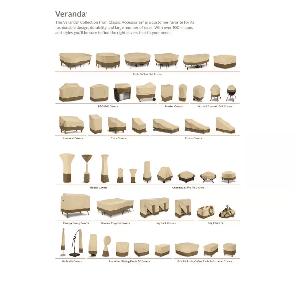 A customer favorite for its fashionable design, durability and extensive collection of matching products, the Veranda line features our heavyweight Gardelle woven polyester fabric and special water-repellent and resistant undercoating. When you buy a Classic Accessories grill or patio furniture cover you are not just getting a cover; you’re also purchasing peace of mind. Not only will your grill and patio furniture be protected from the elements, but you’ll be protected with the easiest warranty in the industry. If your product fails within the warranty period, look for us online and take advantage of our Hassle-Free warranty program supported by our US-based customer service team.