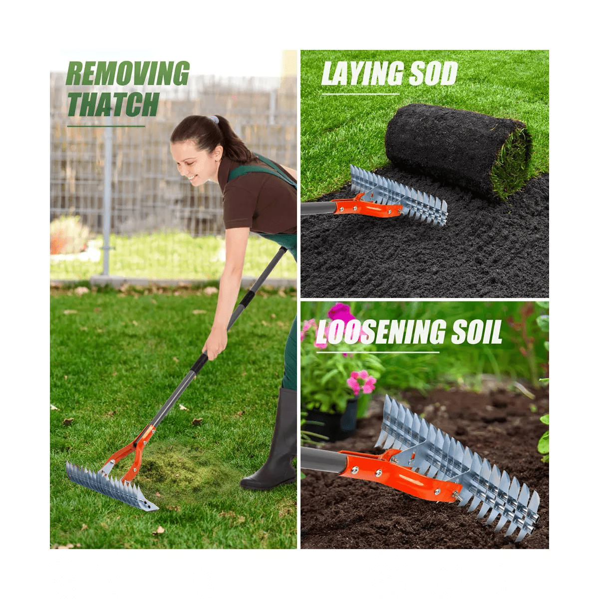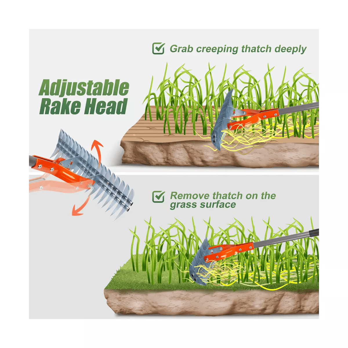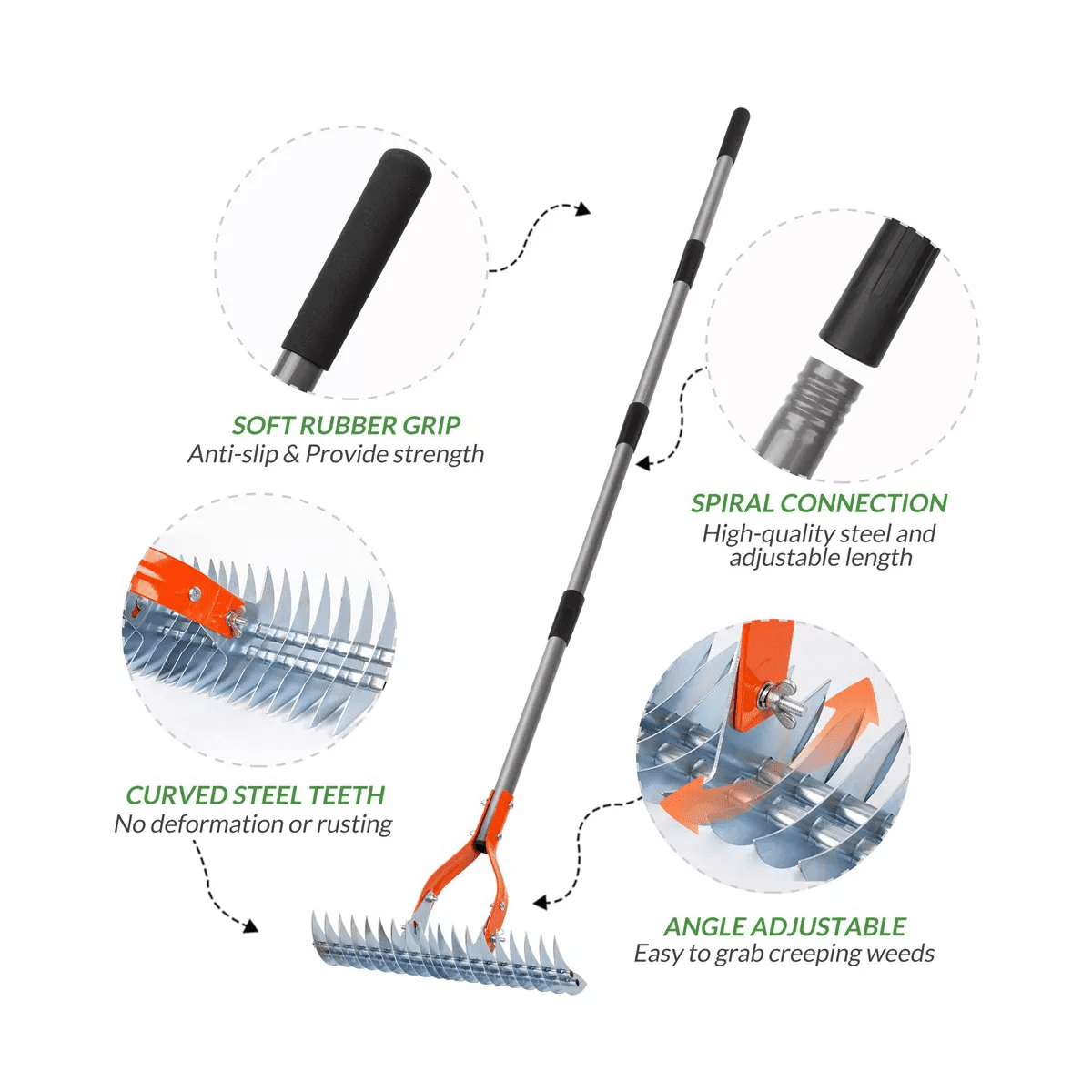 The Walensee Thatch Rake is efficient for removing thatch, laying sod, loosening soil and helps clean leaves, branches, and debris, allowing your lawn to absorb air and sunlight for healthier growth. Its ergonomic handle provides leverage, easing back strain while clearing dead grass. The soft rubber grip is anti-slip and can provide strength while use. Its spiral connection, made of high quality steel, can provide adjustable length. Curved steel teeth, no deformation or rusting. The 5-inch long tines and 15 inches wide rake head penetrate beneath the surface to remove debris and loosen topsoil, improving drainage and aeration for better grass root growth. The working angle is adjustable, easy to grab creeping weeds deeply and remove thatch on the grass surface. With multiple sections, the rake’s length can reach to 40 inches, 55 inches and 70 inches. Its detachable design makes storage convenient, and the pre-assembled head is ready for use with a simple tightening.