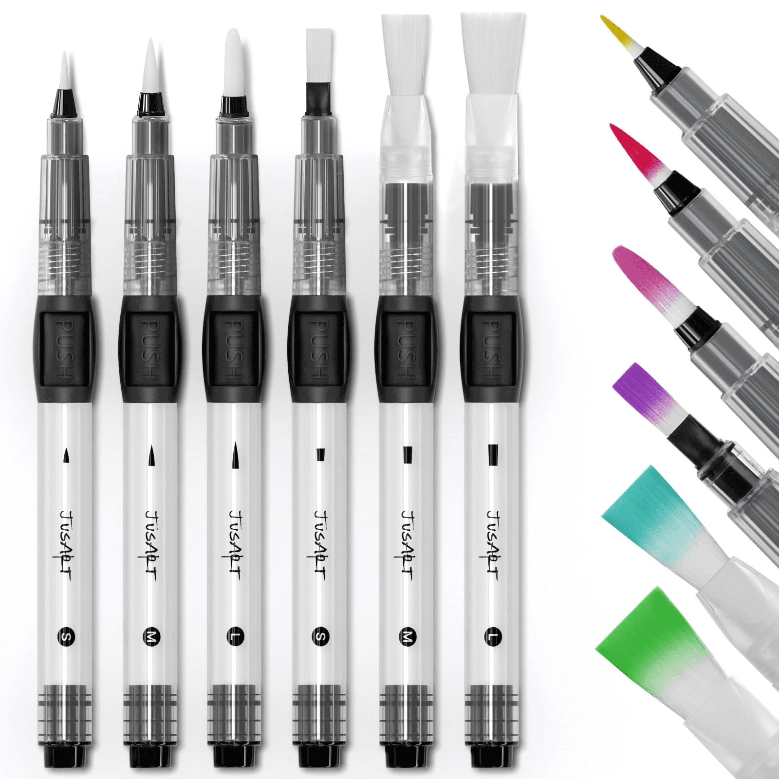 JusArt Water Brush Pens 6-Pack Leak-Proof Refillable Watercolor Pens for Acrylic and Gouache Painting – Includes Pointed & Flat Tip Styles – Portable Water Brushes for Artists, Beginners