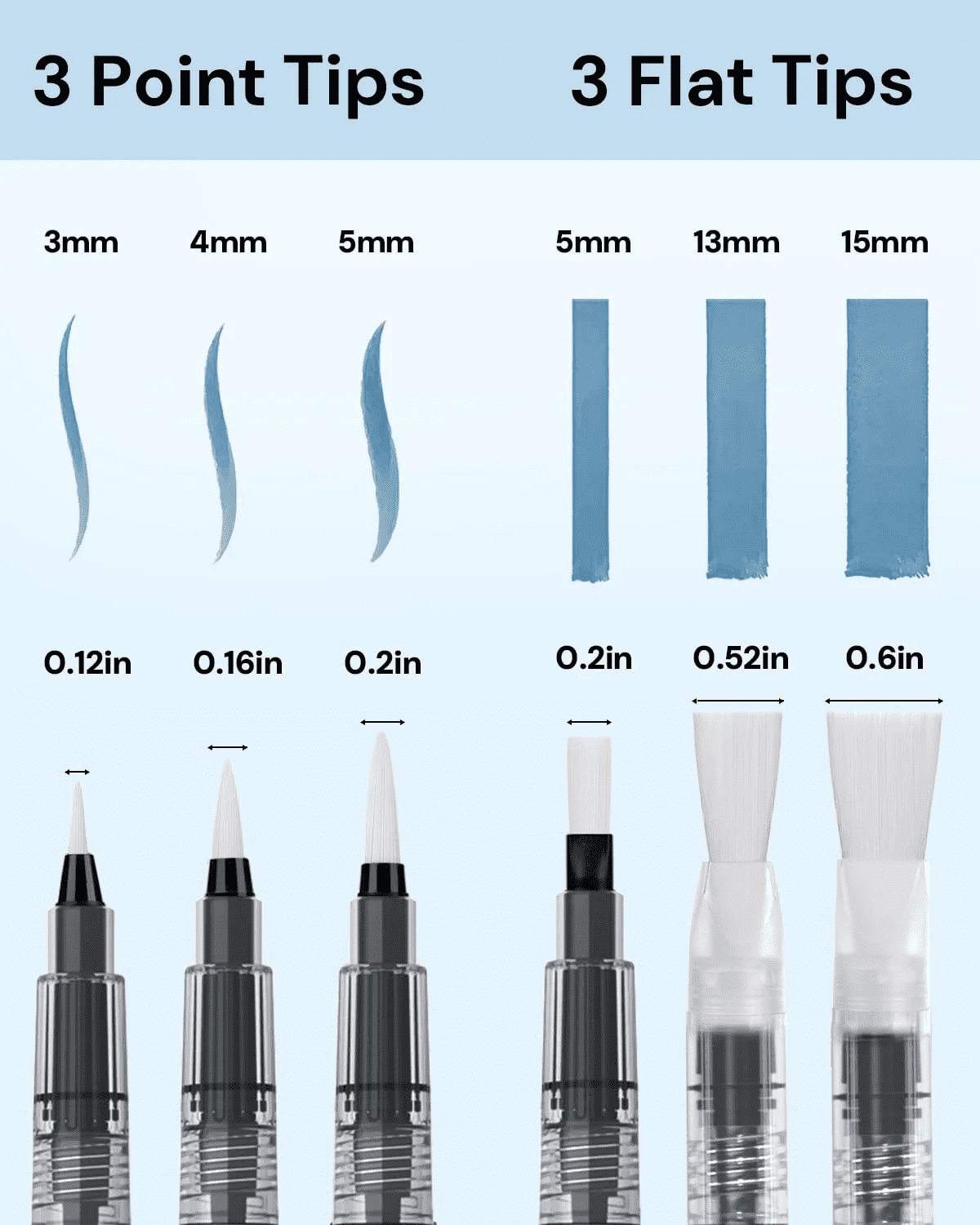 - 【Easy Clean & 6-Piece Set】 This watercolor brush-pen set contains 3 pointed and 3 flat brushes, each in 3 sizes. Rinses clean in seconds — simply wipe and reuse! An ideal starter set for students and art enthusiasts