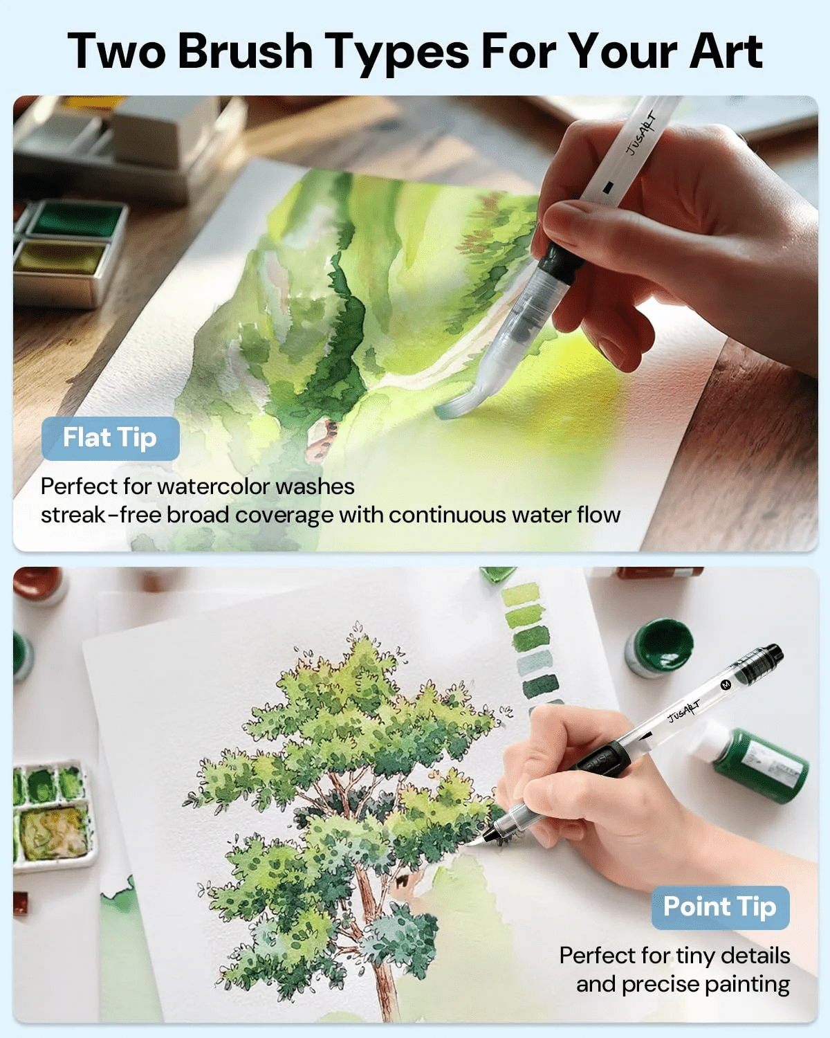 - 【Multi-purpose Water Brush Pen】Works on paper, canvas, wood, and more! Use with water-soluble pencils, inks, or powdered pigments. The flat brush pen blends colors smoothly like a pro tool