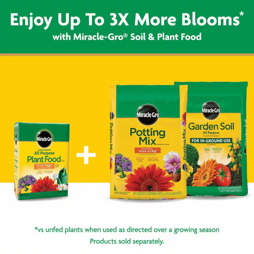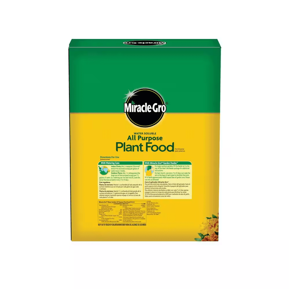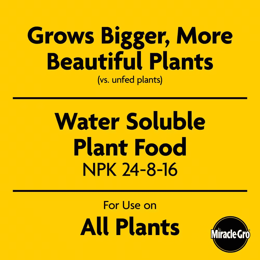 Grow bigger and more beautiful plants with Miracle-Gro Water Soluble All Purpose Plant Food (vs unfed plants). This gardening product feeds plants instantly. In addition, it’s safe for all plants and won’t burn plants when used as directed. Use with all types of indoor or outdoor plants, including flowers, vegetables, houseplants, roses, trees, and shrubs. This plant food may be used with container plants or in-ground gardens. To apply to indoor plants, use the small end of the included scoop (1/2 tsp) and mix plant food with 1 gallon of water in a watering can. Reapply every 2 weeks. For outdoor plants, use the large end of the included scoop (1 1/2 tbsp) and mix with 1 1/2 gallons of water in a watering can. Reapply every 7 to 14 days. When using in large garden areas, fill a Miracle-Gro Garden Feeder (sold separately) and follow feeder directions. For best results, just soak the soil at the base of each plant to fertilize the roots. One 10 lb. container of Miracle-Gro Water Soluble All Purpose Plant Food feeds approximately 4,000 sq. ft. of garden area.