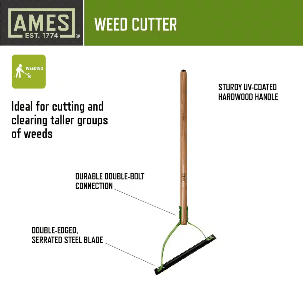 Tackle weeds and tall grass with this weeding tool set. This all-in-one wood long handle set includes a weeding hoe, a 2-Prong weeding hoe, and a grass weed cutter. The durable weeding hoe features a 54 in. hardwood handle and looped steel blade for push-and-pull action to remove weeds easier. Designed for close cultivation around existing plants, the multi-purpose weeding hoe features a flat side for chopping, weeding and clearing, as well as a pointed side for cultivating and turning soil. This durable weeding set features wood handles, cushioned end grips and strong connections for additional durability.