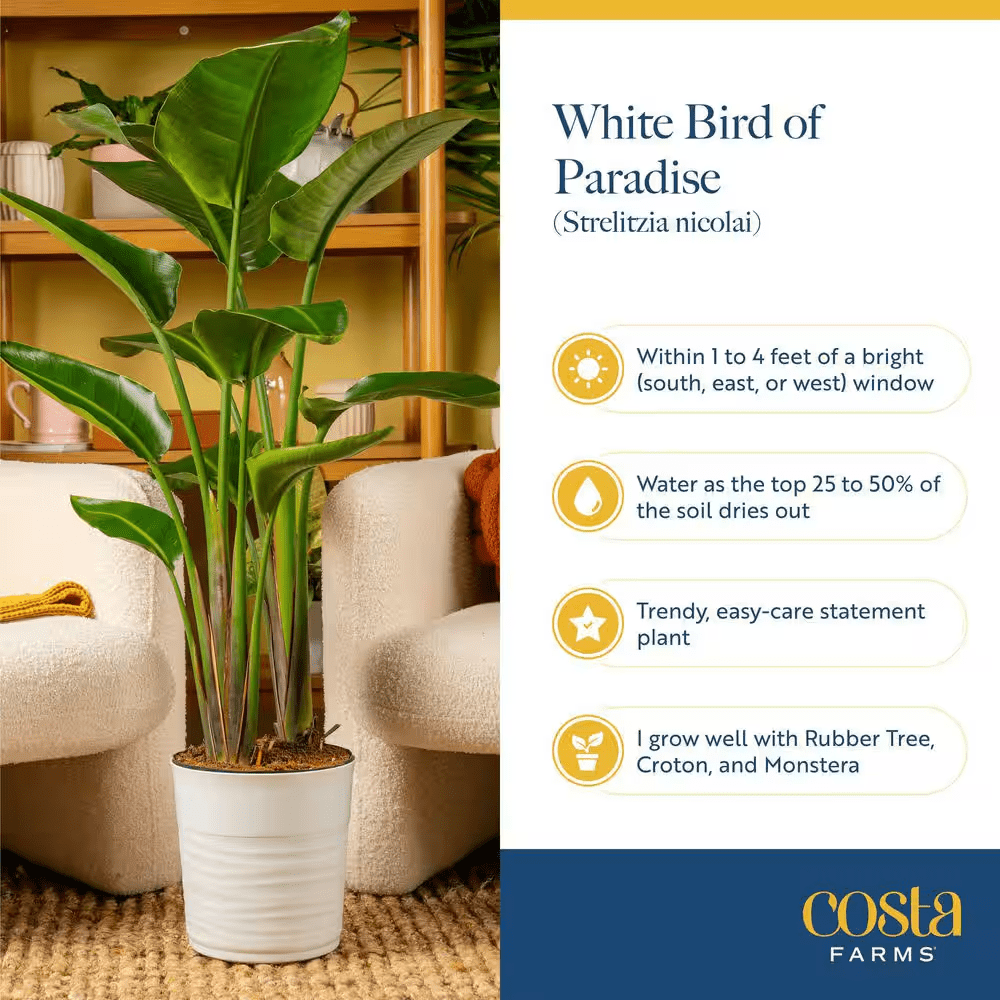 The Costa Farms White Bird of paradise is a stunning tropical plant commonly grown as a houseplant throughout the country and a landscape plant in the frost-free tropics. As houseplants, they add elegance with the bold textural leaves. White bird of paradise, in particular, is perfect for adding vertical presence to a room and is an ideal plant for filling empty corners or breaking up an expanse of empty wall. Ships in a light-weight planter ready to decorate your space.
