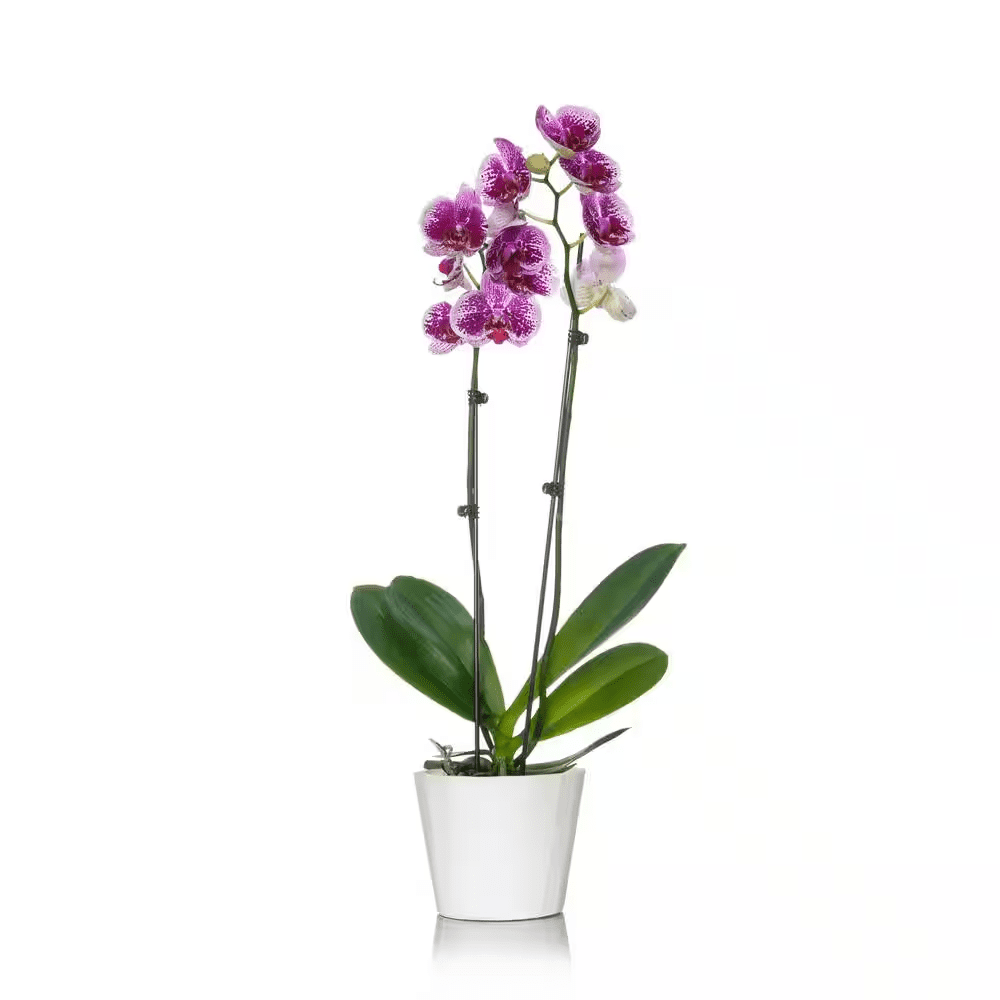 A beautiful 5 in. double stemmed orchid nestled in a silver or gold holiday ceramic pot with coordinating floral pick. A premium selected plant with 6 or more flowers and buds. A proven bloomer and stunning plant, this flower is guaranteed to be a focal point in any interior room. Orchids are known for their elegance and architectural shape – an impressive gift for any recipient. Just Add Ice Orchids is one of the most trusted floral brands in North America, providing top quality floral and plant products. Simply add three ice cubes per week – It’s Just that simple.
