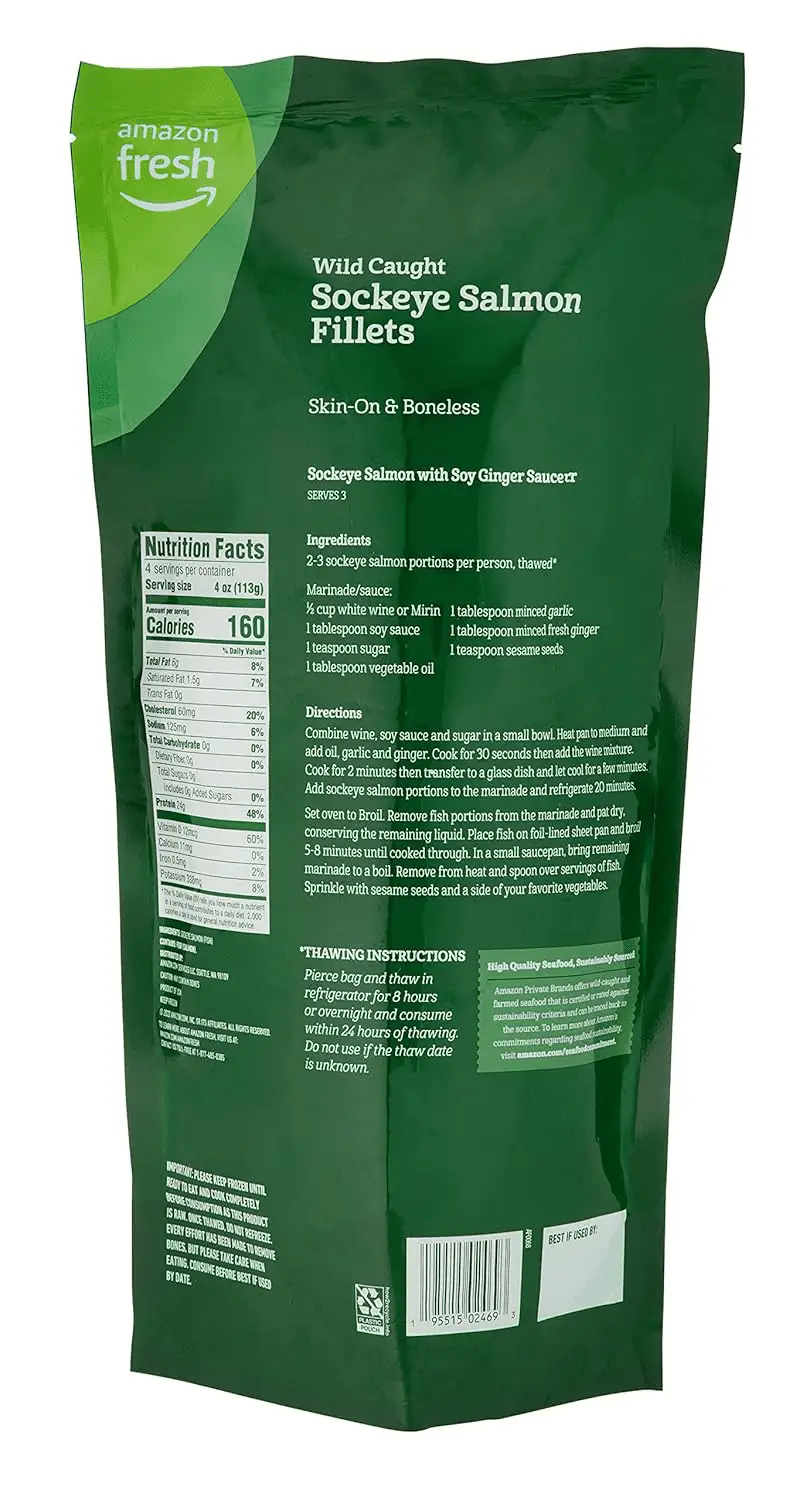 Amazon Fresh – Wild Caught Alaskan Sockeye Salmon, 1 lb (Frozen), 1-pound resealable bag of frozen sockeye salmon boneless, skin-on fillet portions, WHY YOU’LL LOVE IT: This flavorful, deep red-hued salmon is perfect for grilling, baking, broiling, or pan-frying.