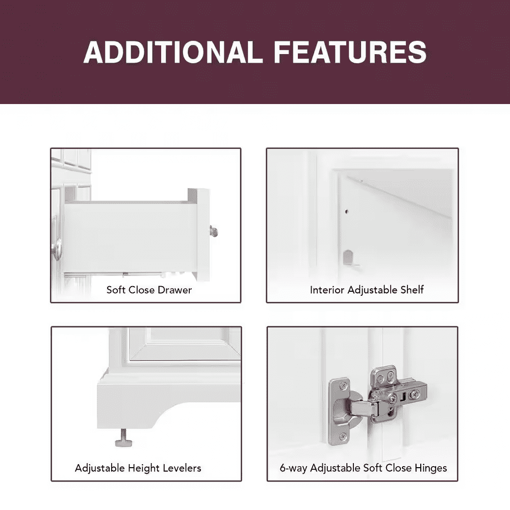 - Features 1 tilt-down drawer, 2 soft-close doors, and 1 shelf
