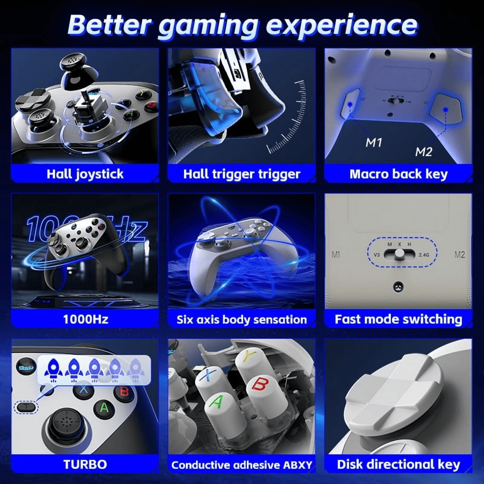 ✅ Pro-Grade Tactility – Mechanical-inspired design with anti-slip grips, responsive conductive silicone ABXY buttons, and asymmetric dual vibration for immersive feedback.
