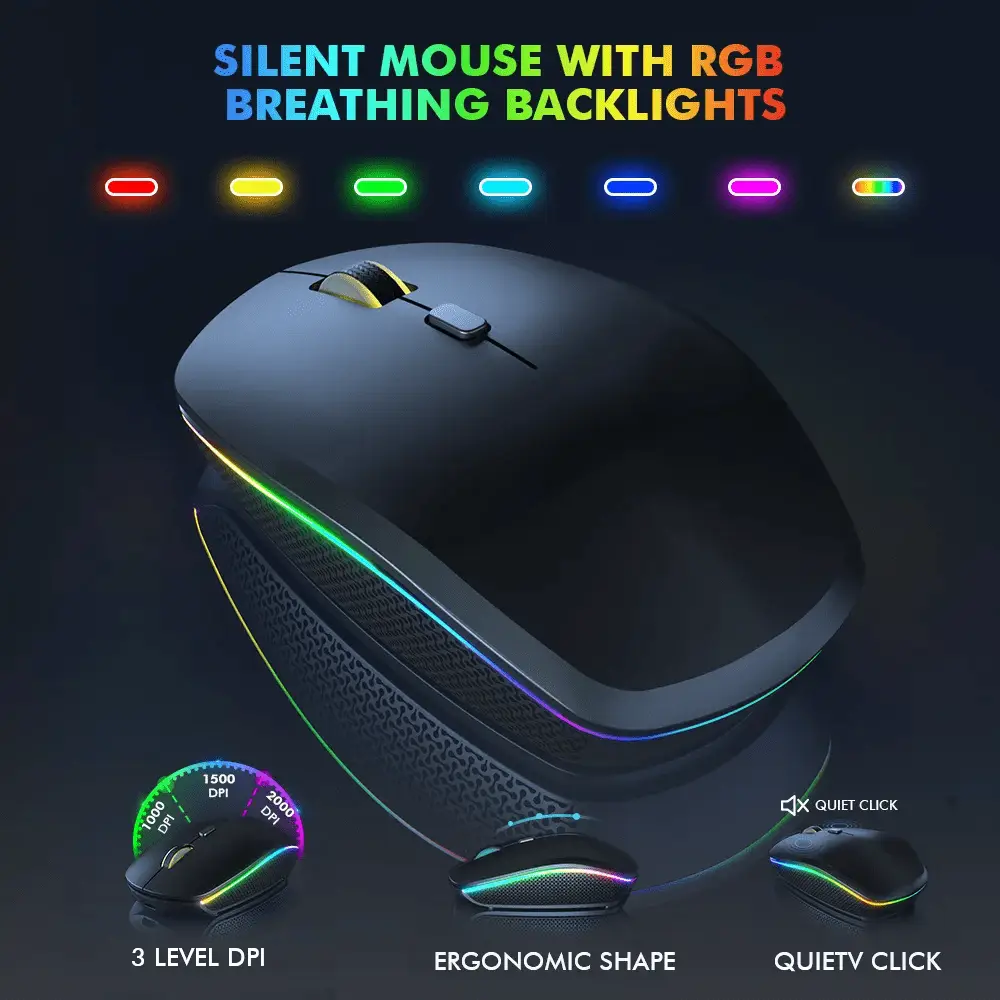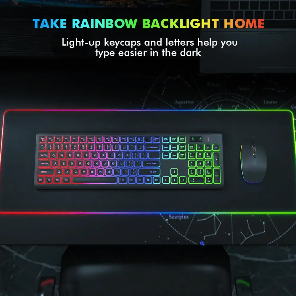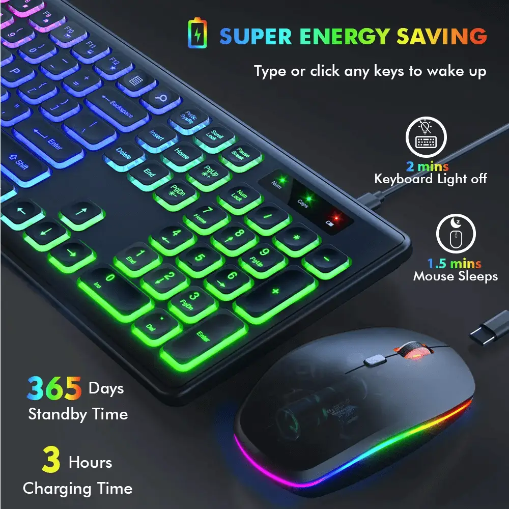 【COOL RGB BACKLIGHT 】 – The keyboard has a rainbow-colored backlight and 3 adjustable brightness settings. The mouse has 15 switchable light effects. Lighting up the key caps and letters helps you use it more easily in low light. 【Long Battery Life 】- The rechargeable keyboard and mouse can be charged with the supplied USB C charging cable. The intelligent auto sleep feature and on/off switch helps you save power. Stay for 30 minutes and the keyboard goes to sleep, stay for 90 minutes and the mouse goes to sleep. 【2.4GHz Wireless & Adjustable DPI】 – Plug and play, easy to use. The keyboard and mouse are wireless using a USB receiver allowing a wireless connection up to 10 meters (33 feet) without any drivers. The mouse features 3 DPI level (1000/1500/2000) optical tracking technology. 【One Keyboard, Dual System Layout 】- Switching between the Mac and Windows dual system bright keyboard layout is as easy as a touch. The USB A to C adapter is ready to fit your system. 【Comfortable Typing & Silent Clicks】 – The folding bracket provides a tilted angle for better typing position. The crater mechanism under each key makes typing more comfortable. The mouse and keyboard are almost silent, so don’t worry about disturbing others. 【Universal Compatibility】 – This backlit keyboard and mouse combo works with your PC, desktop, laptop or notebook. Compatible with Windows, Linux, Chrome and Mac (note: multimedia keys may not be fully compatible with Mac OS systems).