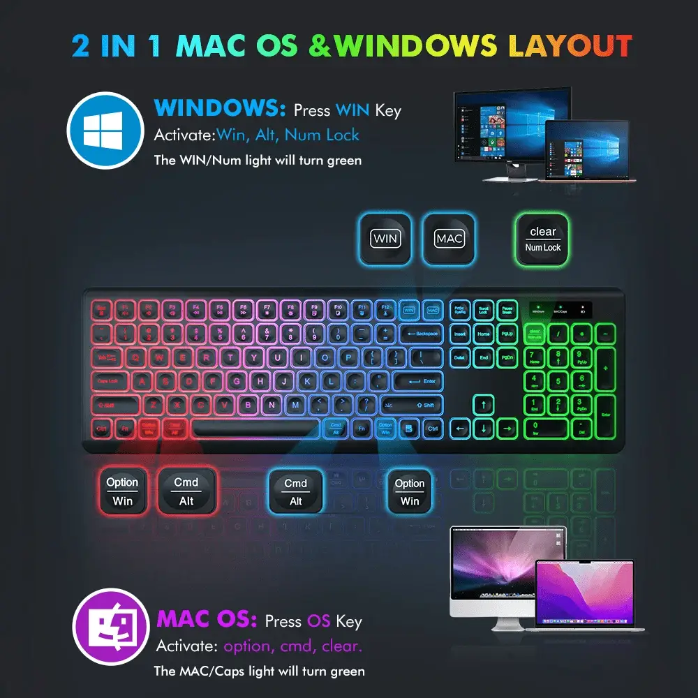 - 👍 DUAL-SYSTEM COMPATIBLE KEYBOARD LAYOUT – Transitioning between the Mac and Windows configurations of the dual-system illuminated keyboard is effortless with a mere touch. The included USB A to Type C adapter ensures compatibility with your system.