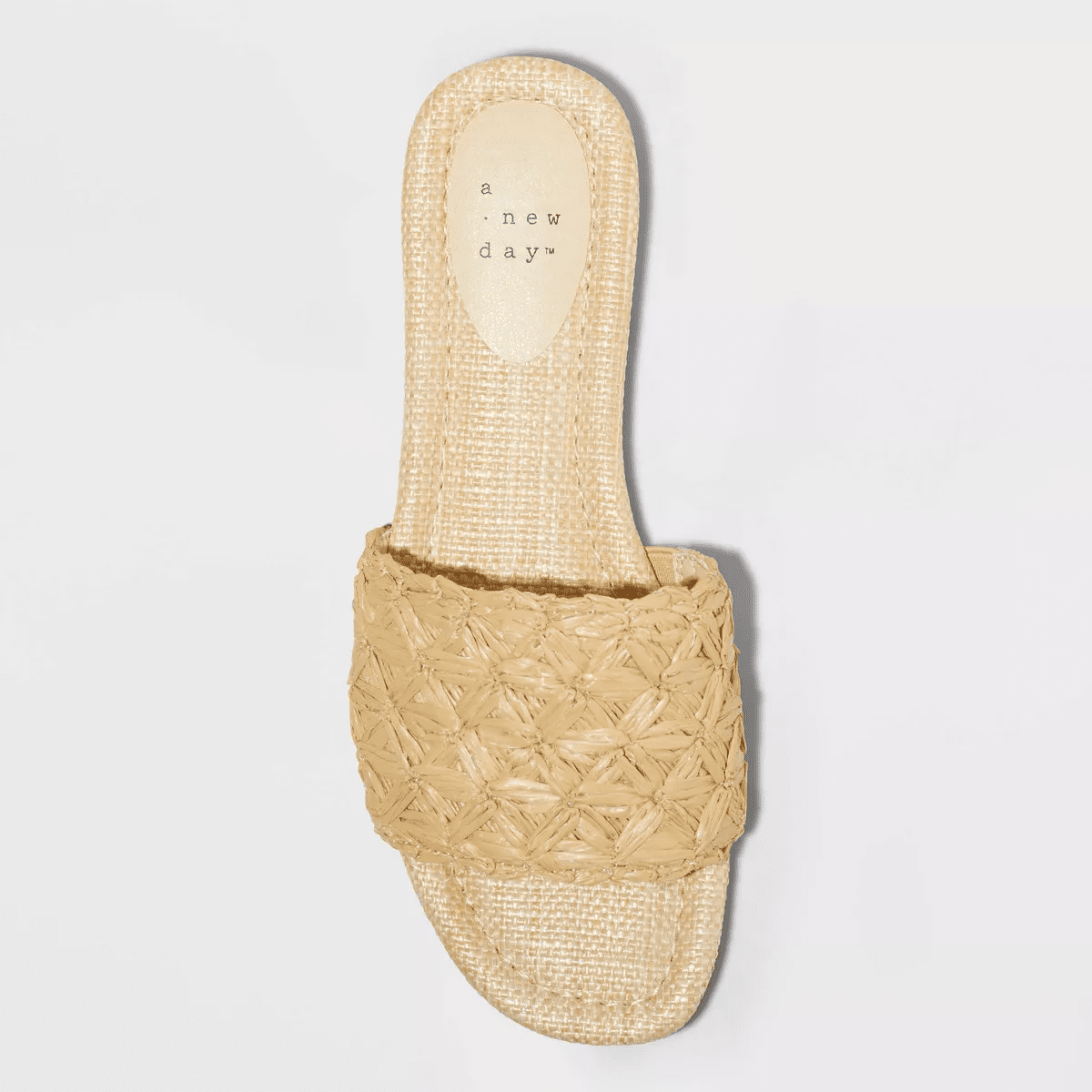 Upgrade your footwear collection with these Ariella Woven Raffia Slide Sandals from A New Day™. These slip-on sandals feature an airy open-toe and back construction that’s enhanced by a raffia-like woven upper for a standout look. Designed with a memory foam insole for comfortable walking, these sandals are great for all occasions.