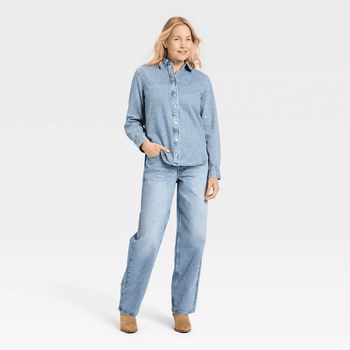 Add some sparkle to your wardrobe with this Denim Button-Down Rhinestone Shirt from Universal Threadâ„¢. Dotted with tiny rhinestones on a light wash backdrop, this regular-fit shirt is made from lightweight cotton-recycled cotton blend denim fabric for all-day comfort. It features a collared neckline, shirttail hem, back yoke with a box pleat and long sleeves with buttoned cuffs. A full-length button placket down the front completes look with versatile wear and layering options.