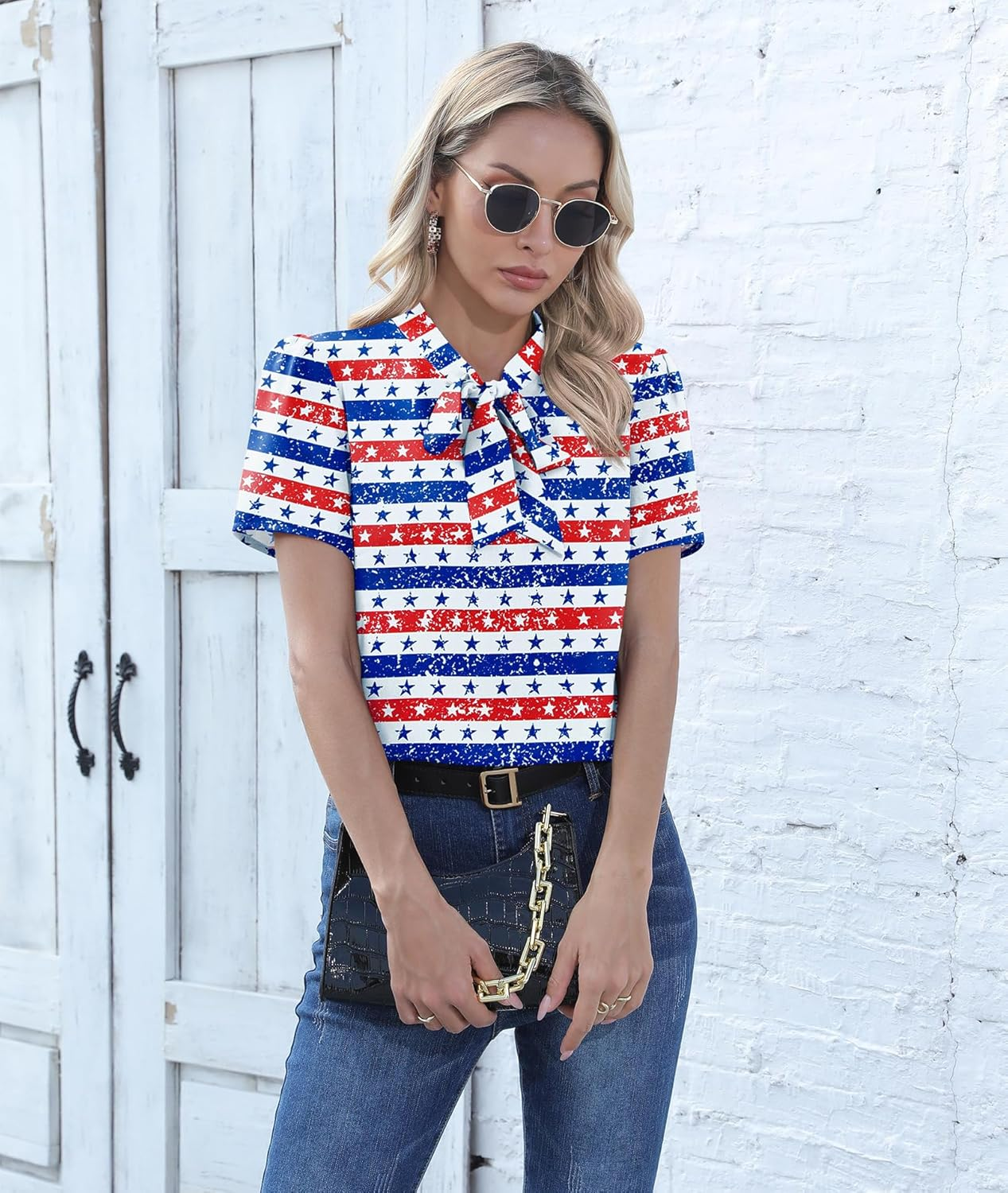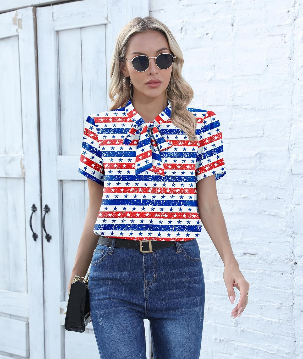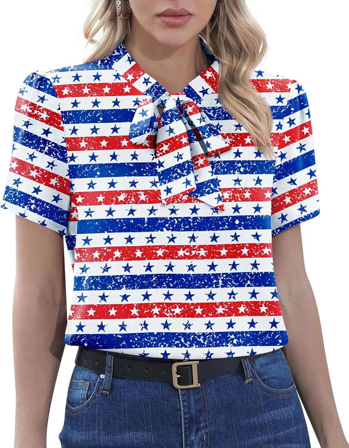 Style: Bow Tie Knot in the Front, Short Sleeve, Chiffon Blouse, Mock Neck, Elegant Blouse.