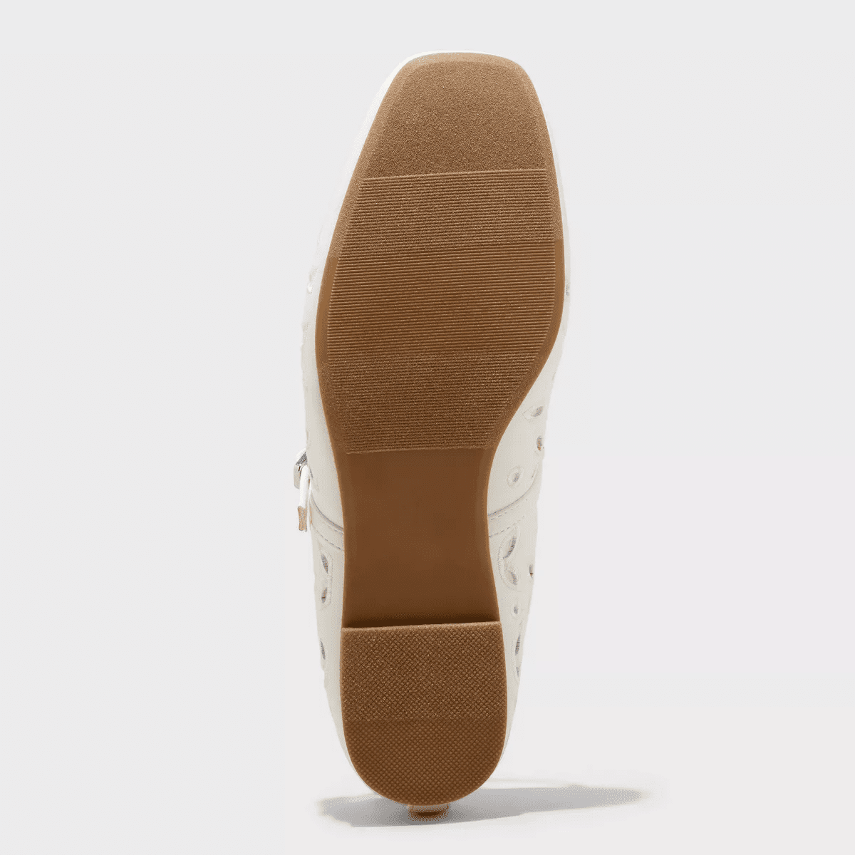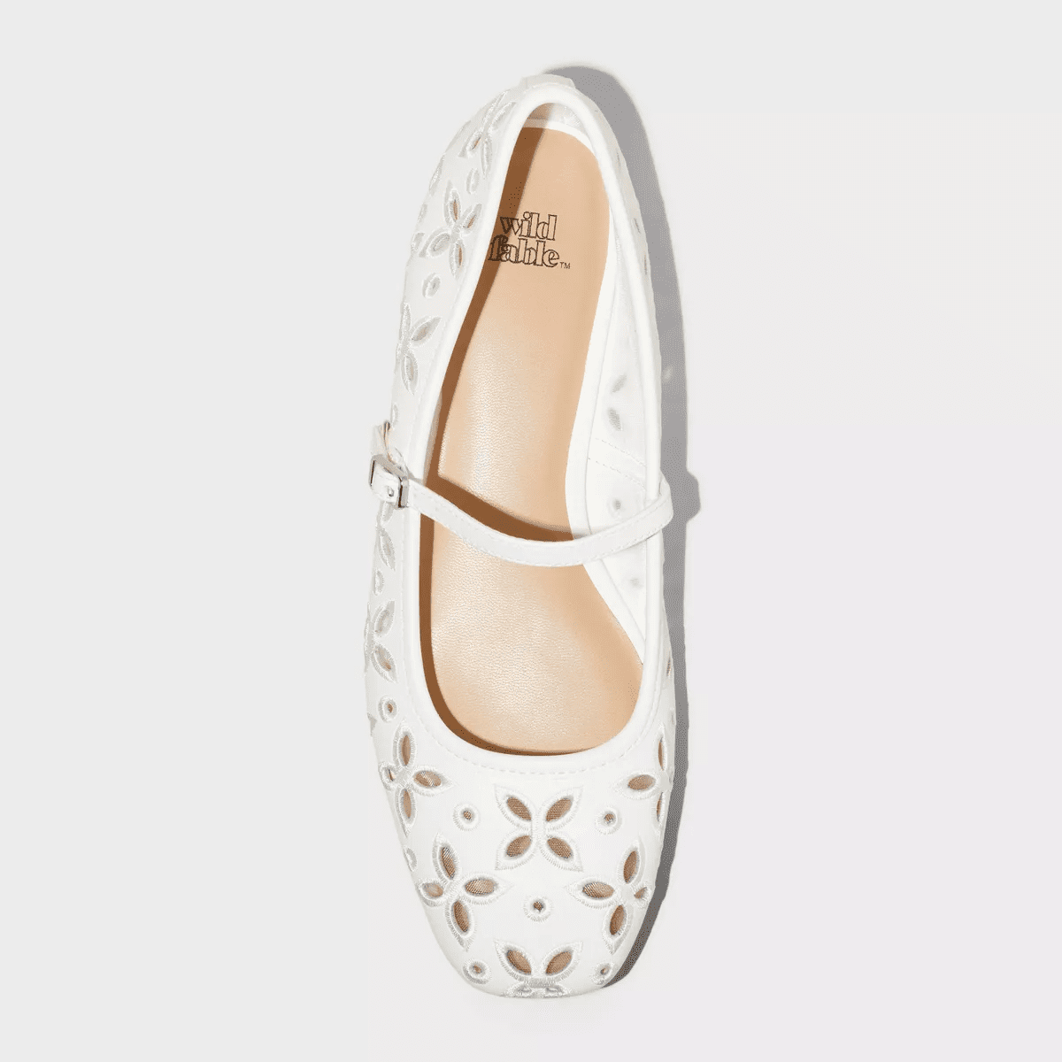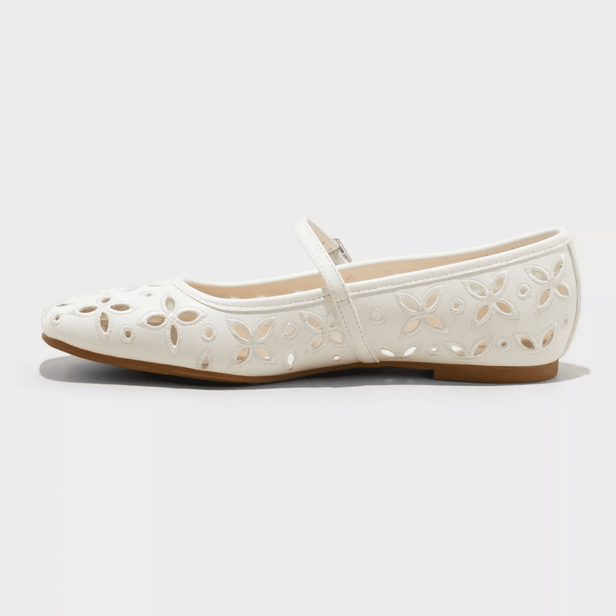Elsa eyelet Mary Jane ballet flats from Wild Fableâ„¢ with a memory foam insole. Feature a faux-leather upper adorned with an embroidered eyelet pattern. White faux-leather instep strap with a buckle fastening completes the design and provides a customizable fit.