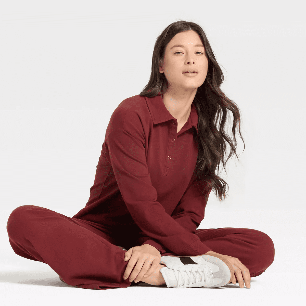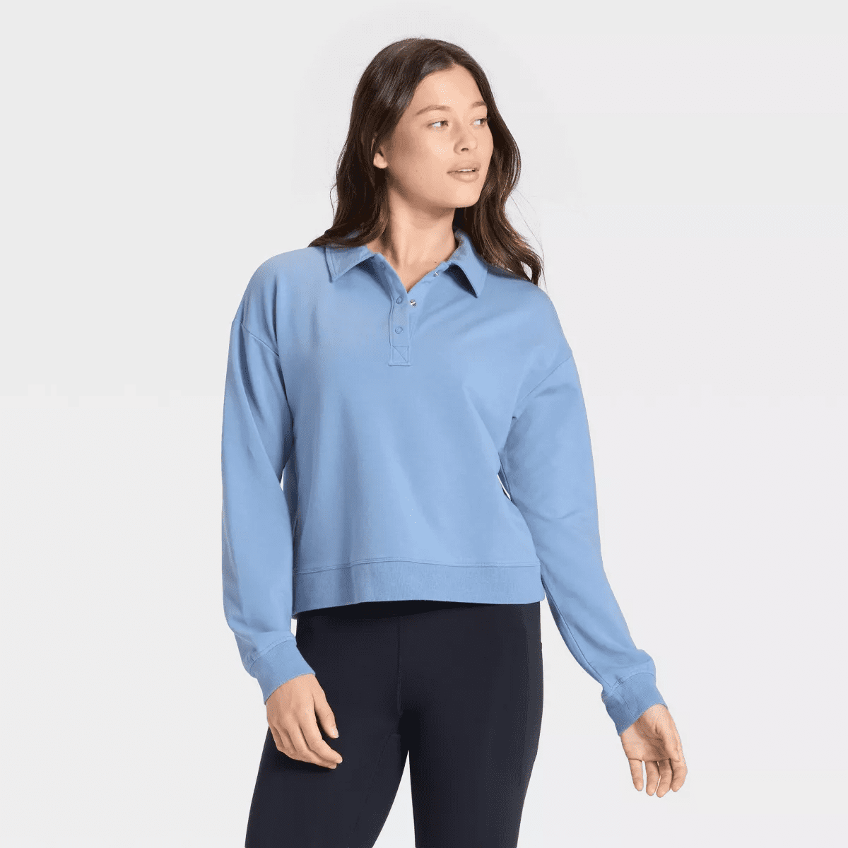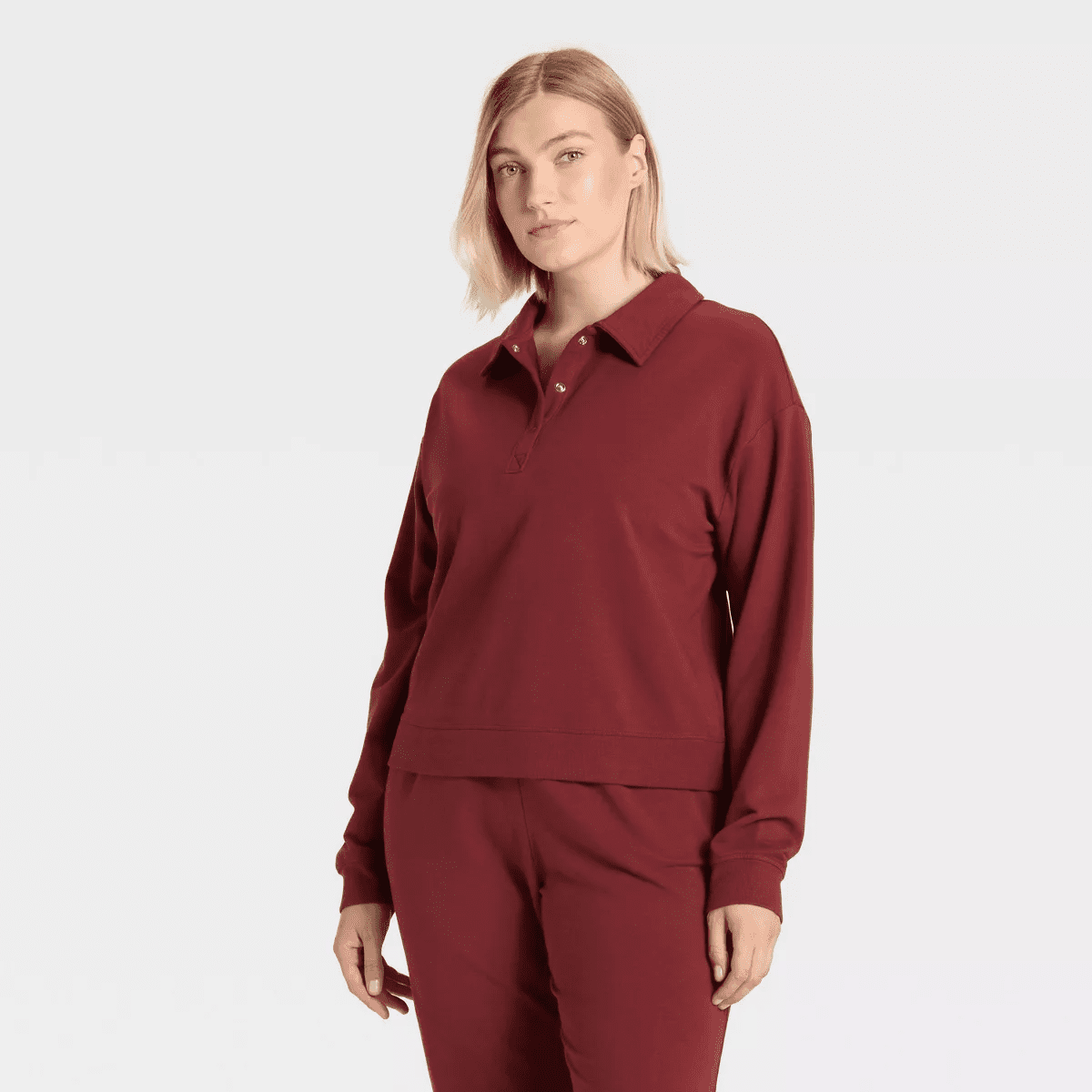 - Must-have features: collared neckline, 3-snap button placket front, drop-shoulder long sleeves, ribbed edges, relaxed fit, long-length hem
