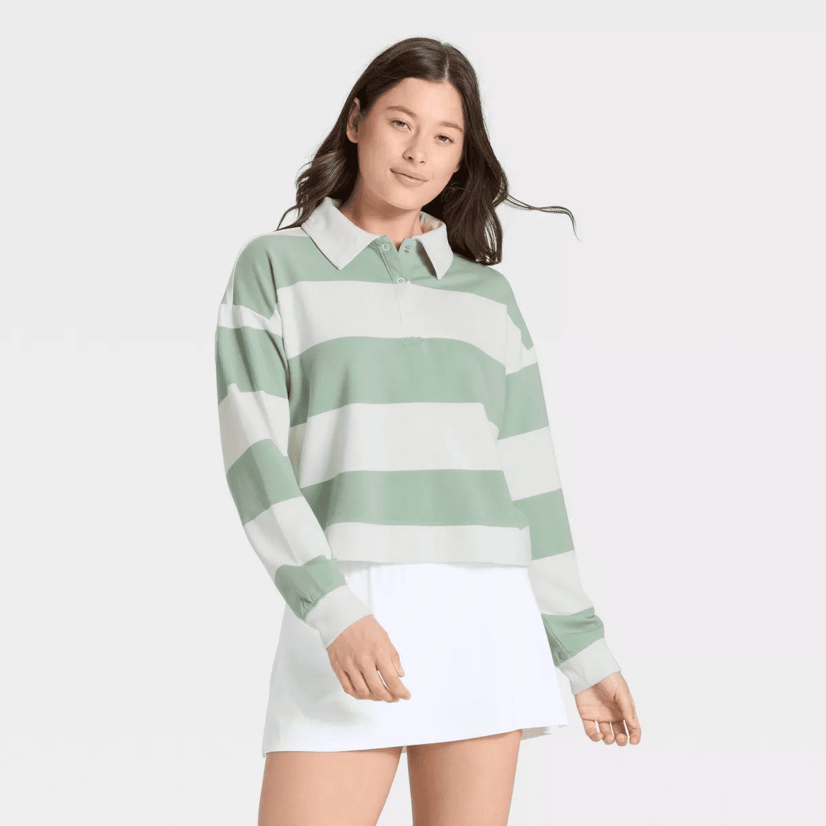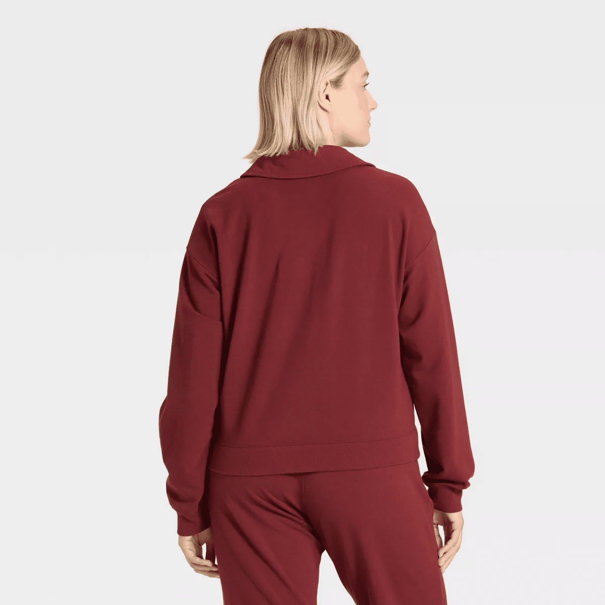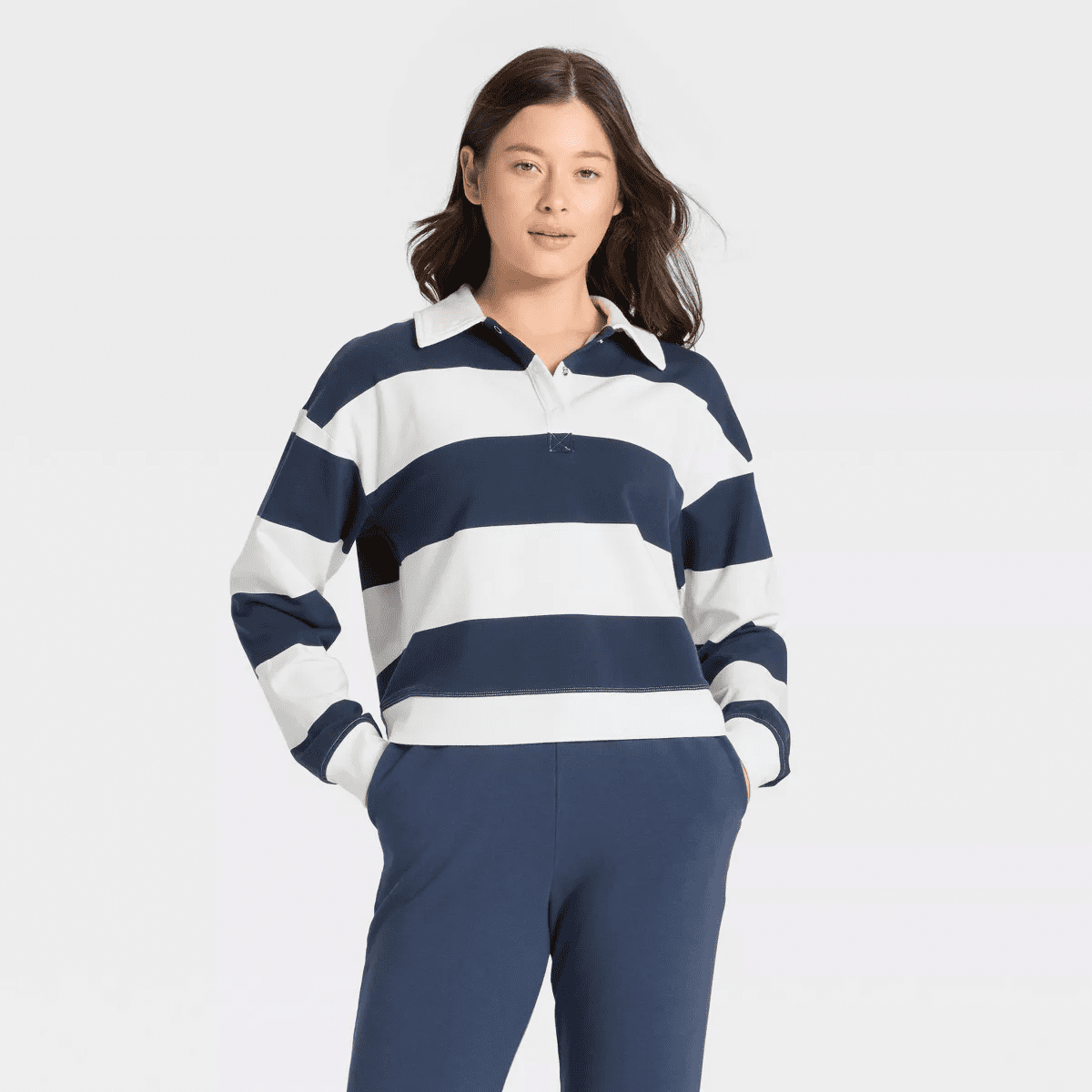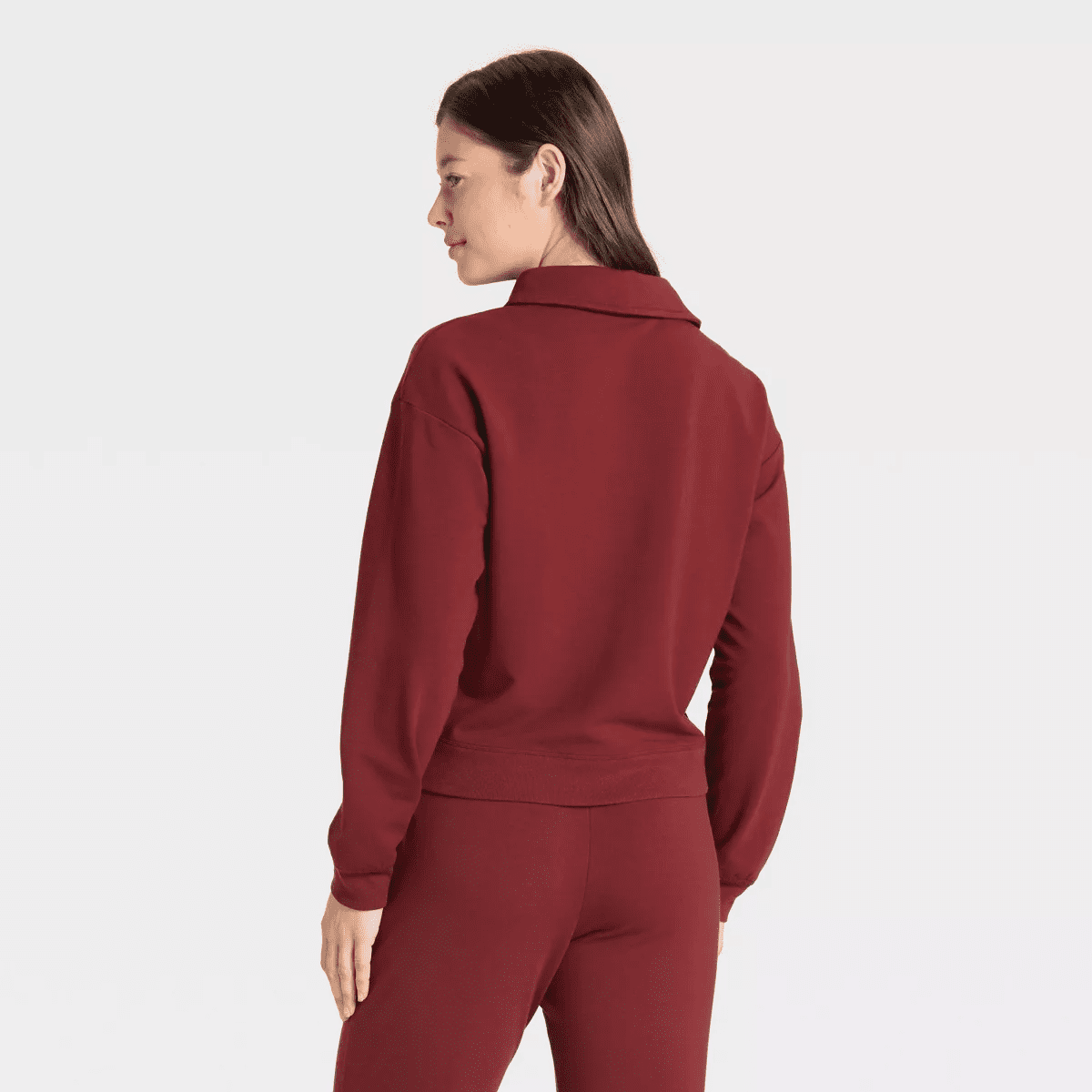 - Must-have features: collared neckline, 3-snap button placket front, drop-shoulder long sleeves, ribbed edges, relaxed fit, long-length hem