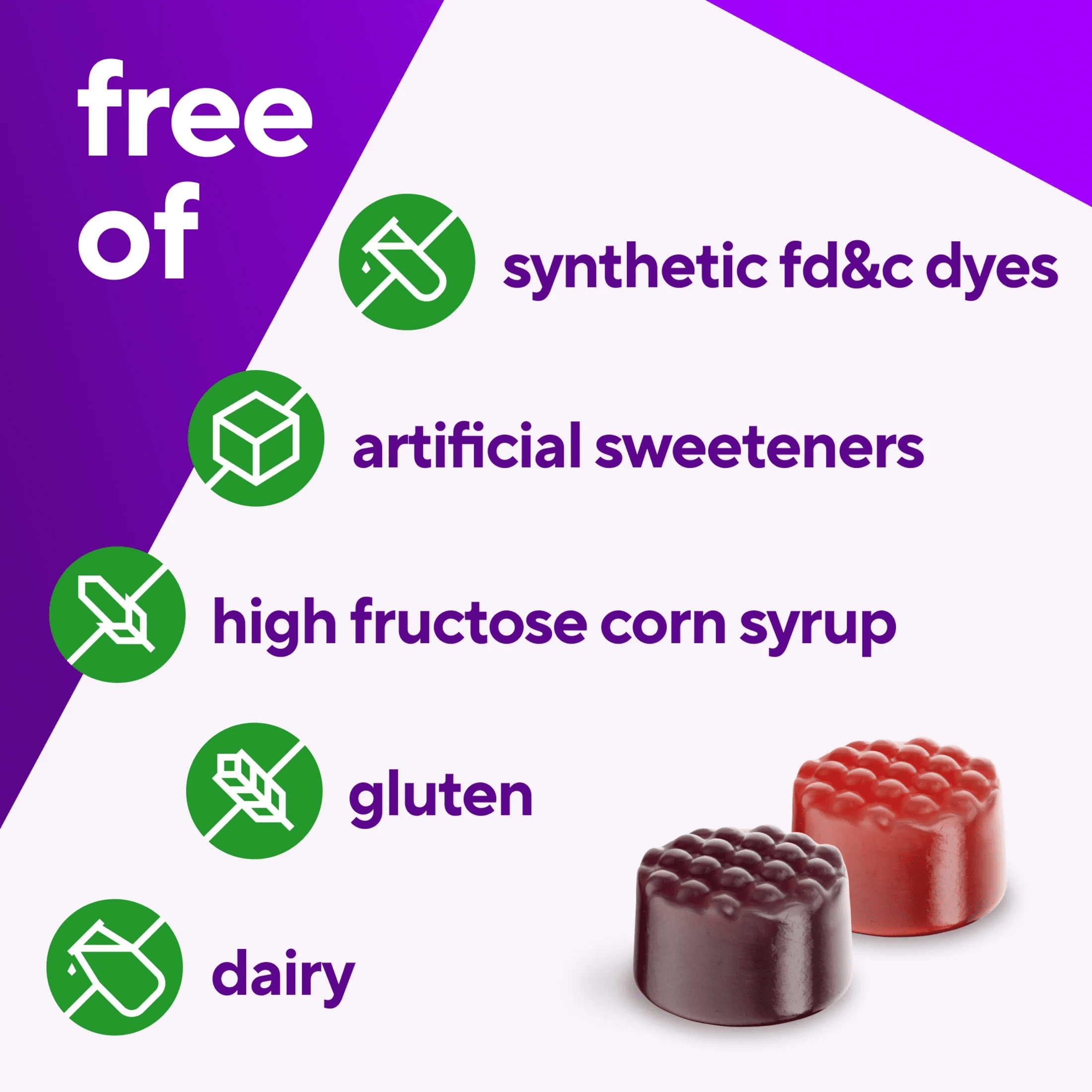 - Daily multivitamin with no high-fructose corn syrup, no artificial sweeteners, no gluten, no dairy, no synthetic FD&C dyes​ including Red Dye No.3