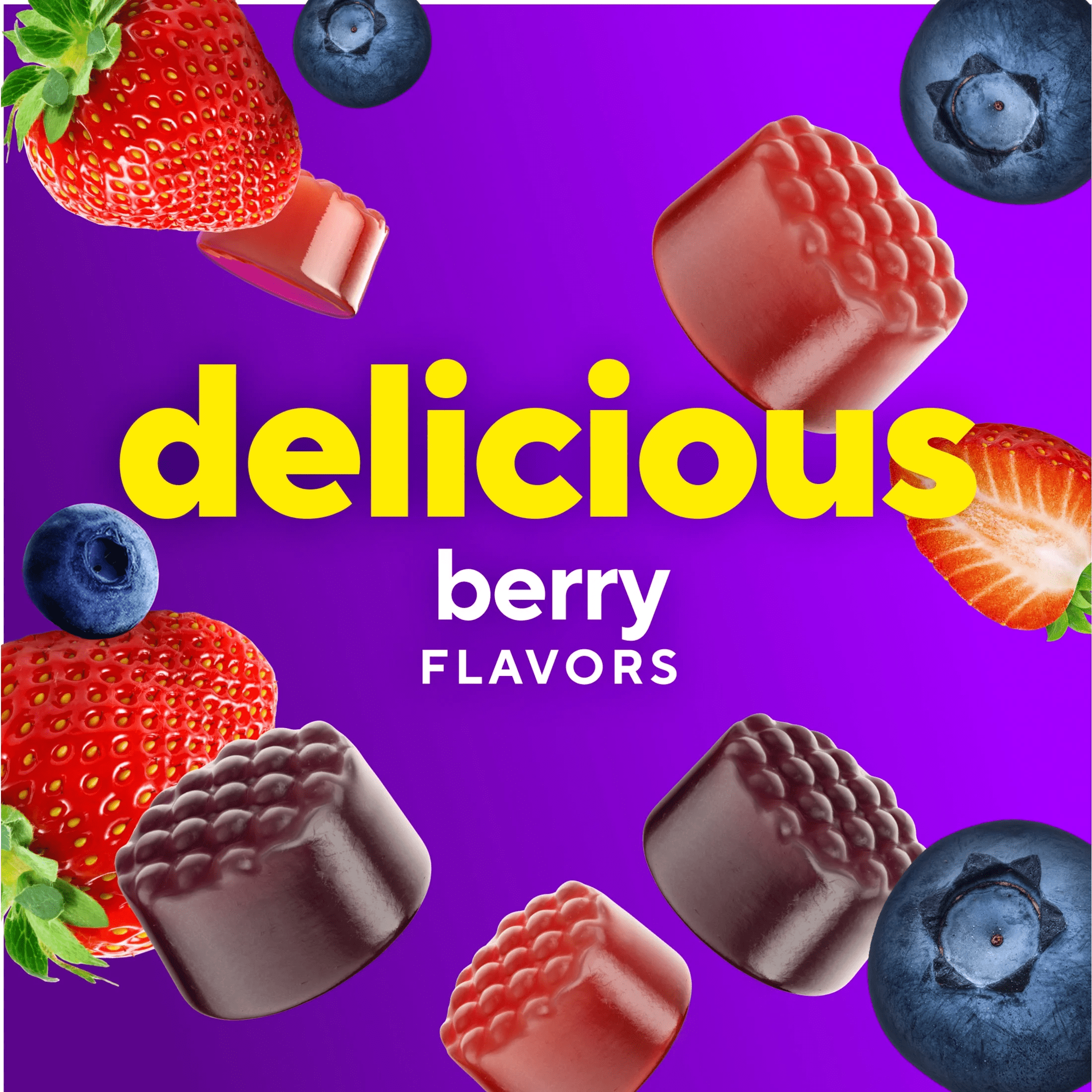 - Berry-flavored vitamin gummies offer delicious, natural fruit flavors in every bite