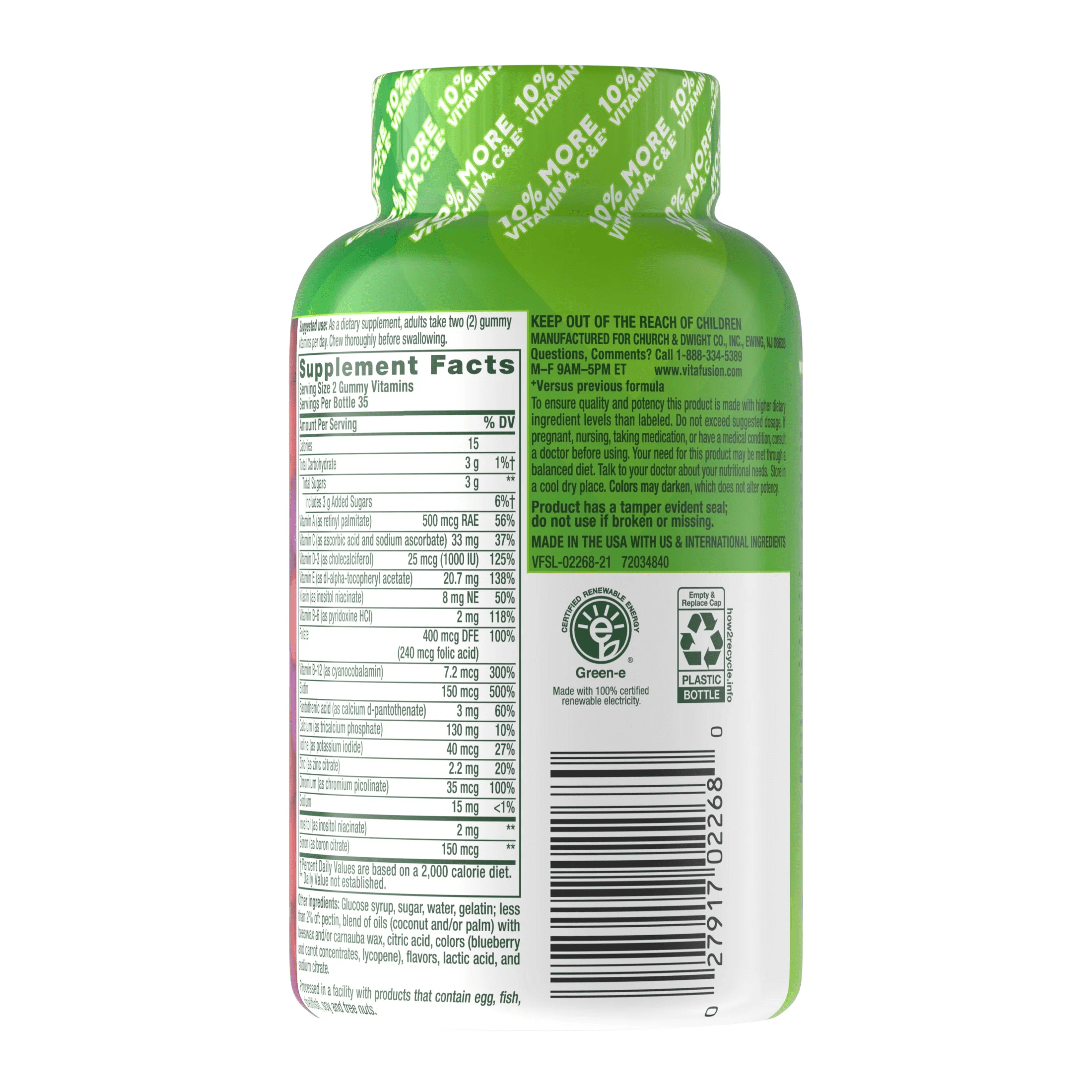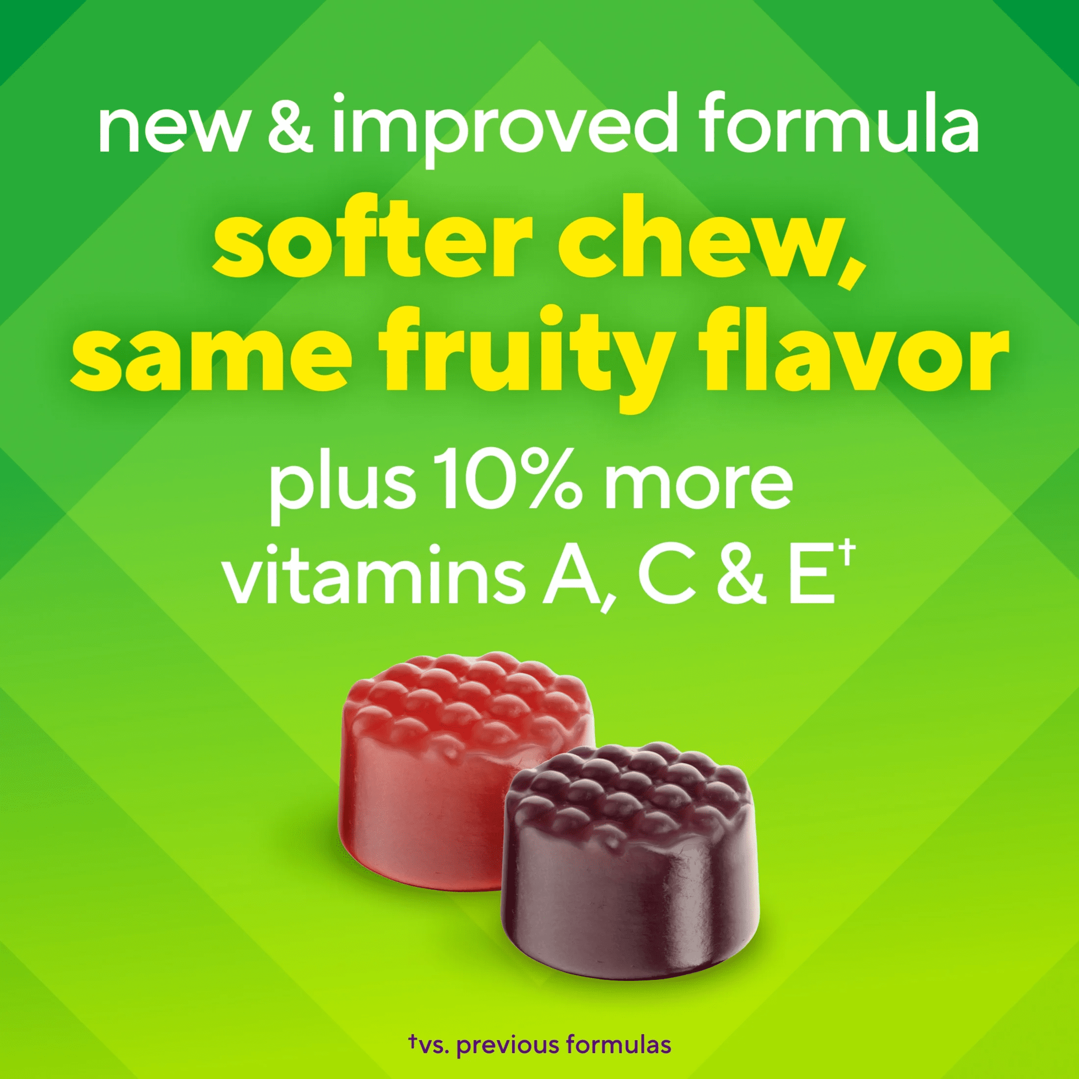 Vitafusion Womens Multivitamin Gummies are daily vitamins formulated to address the health needs of women (1). Each delicious two-gummy serving combines essential vitamins and minerals with natural fruit flavors to provide a great-tasting, convenient alternative to traditional, hard-to-swallow vitamin pills. Vitafusion believes that taste and nutrition can be fused together, ensuring that taking your daily multivitamin is an easy and delicious part of your day. Each serving provides support for your immune system, energy metabolism and bone health (1) with Vitamin A, Vitamin C, and Vitamin D. This women’s multivitamin also contains Vitamins E, B-6 and B-12, along with Biotin, Zinc, Calcium and Folate. These daily multivitamins for women contain no high-fructose corn syrup, no artificial sweeteners, no gluten, no dairy and no synthetic FD&C dyes. This 70-count bottle of vitamin gummies has enough for 75 days. Vitafusion is the only gummy vitamin brand with products that have been awarded the ChefsBest Excellence award for taste; vitafusion Adult Gummy Multivitamins for Women were the recipient of the 2021 ChefsBest Excellence Award (2). Take a fruitful step toward a healthier, happier world with America’s #1 Gummy Vitamin Brand. (1) These statements have not been evaluated by the Food and Drug Administration. This product is not intended to diagnose, treat, cure or prevent any disease. (2) The ChefsBest Excellence Award is awarded to brands that surpass quality standards established by independent professional chefs. Evaluation funded by Church & Dwight Co., Inc.