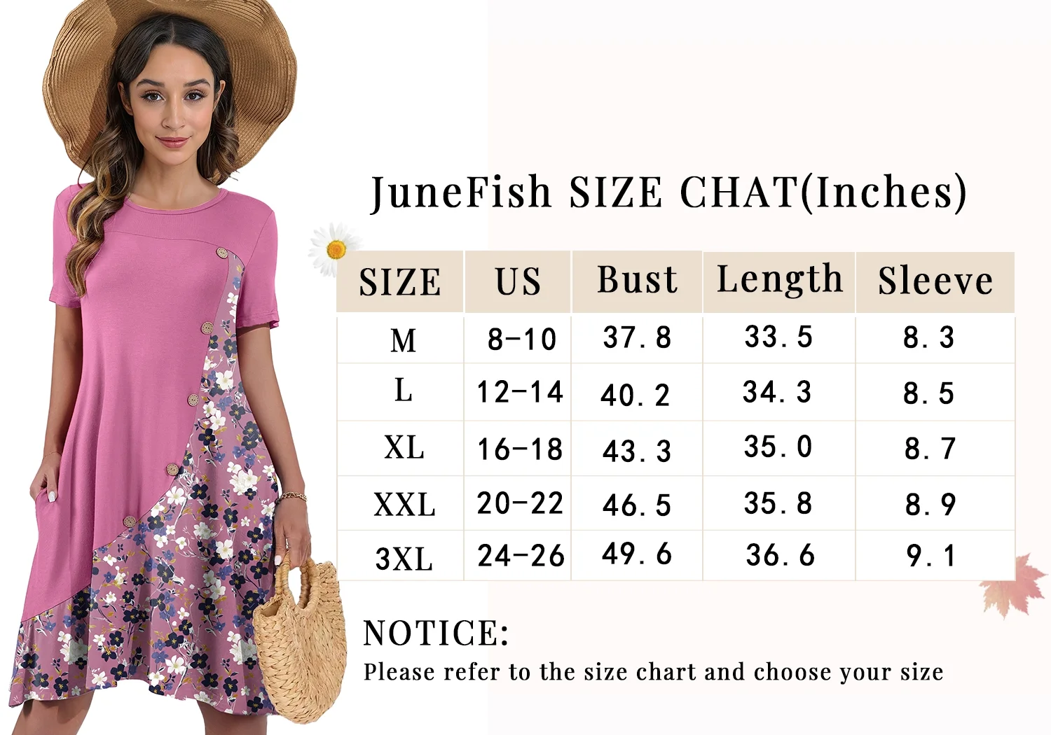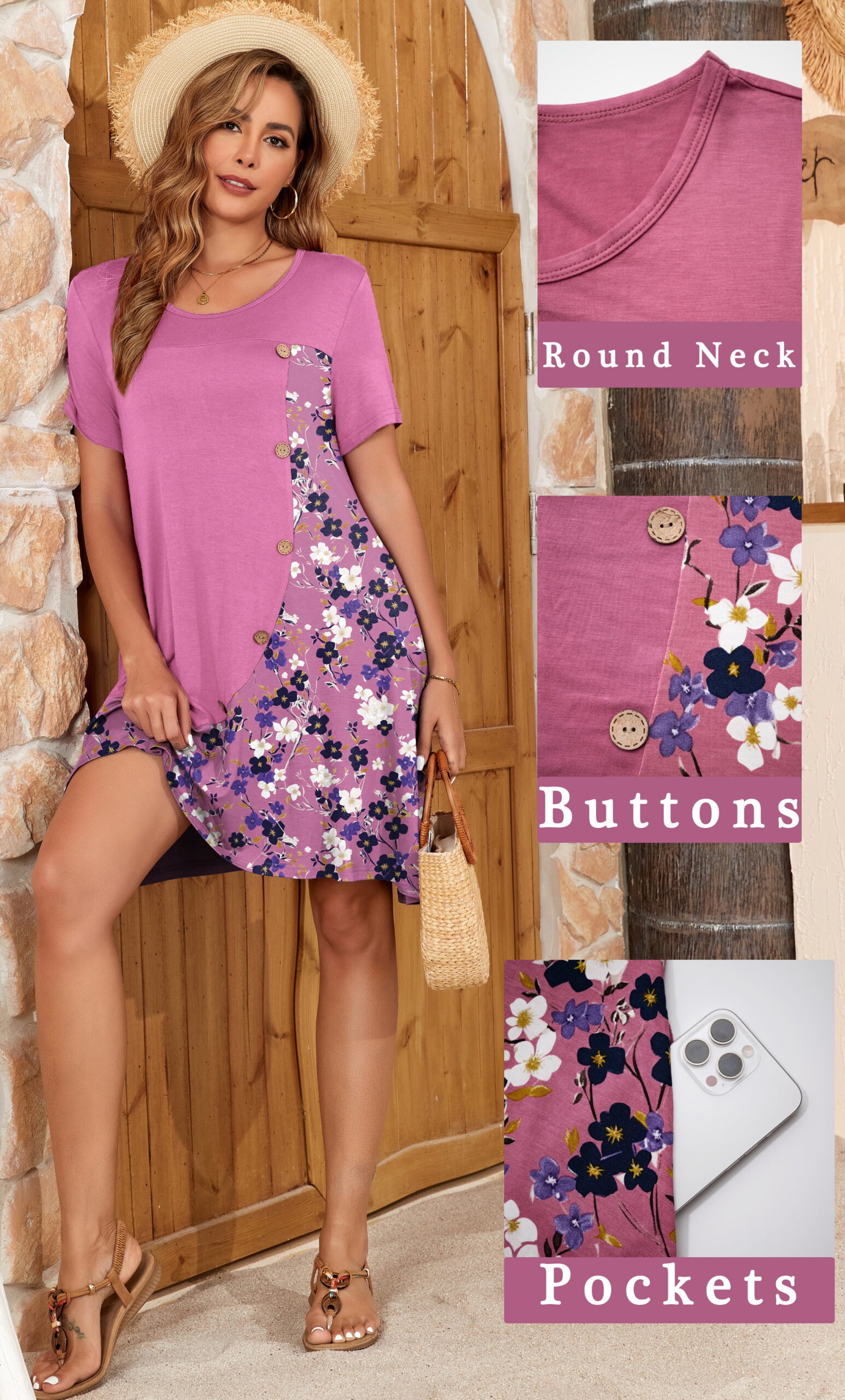 - 【Distinctive Features】 Designed with a classic A-line silhouette, this short-sleeve dress features a unique patchwork design, combining solid color with floral prints. The button accents and hidden side pockets add charm and practicality, while the loose fit ensures a relaxed and flattering look.