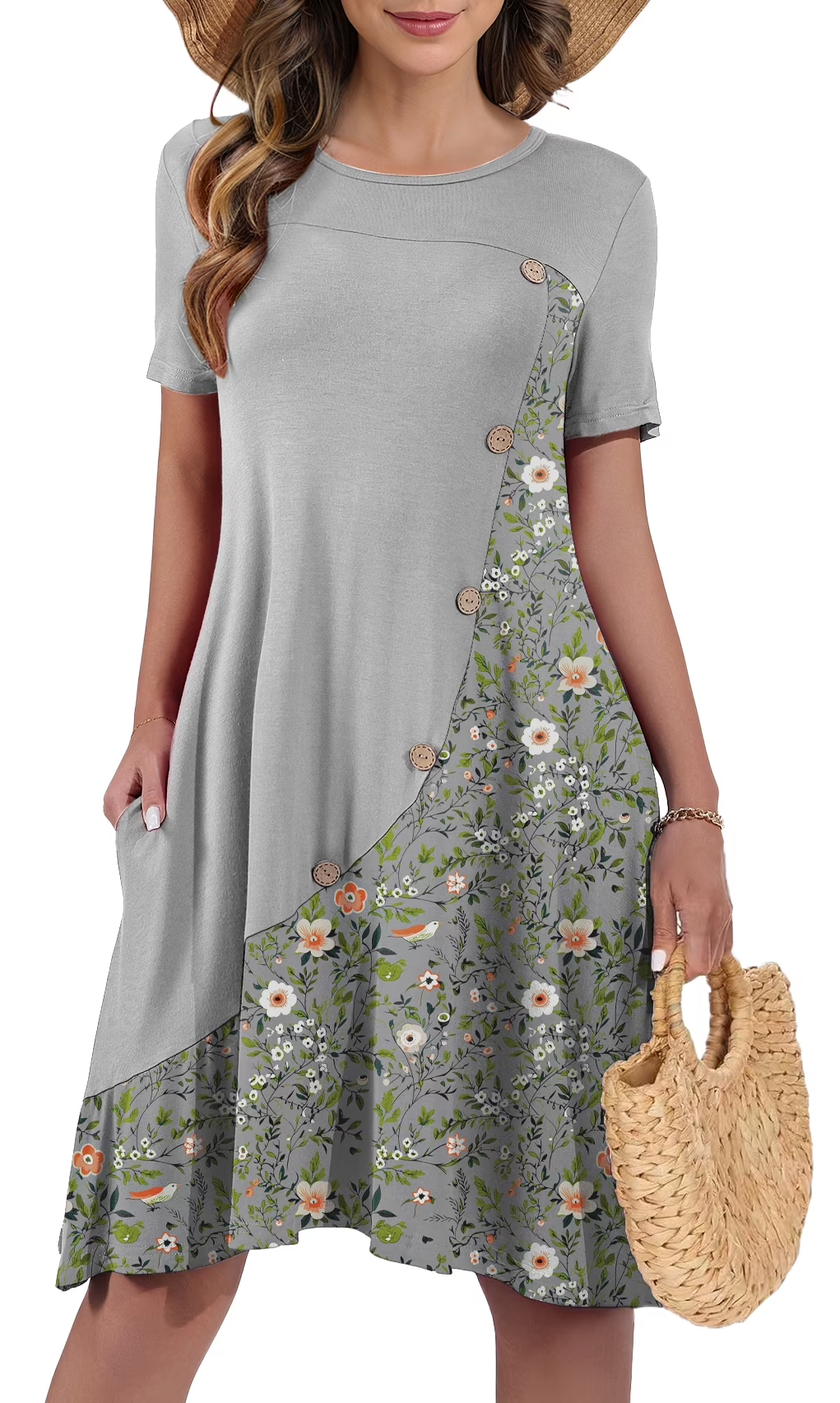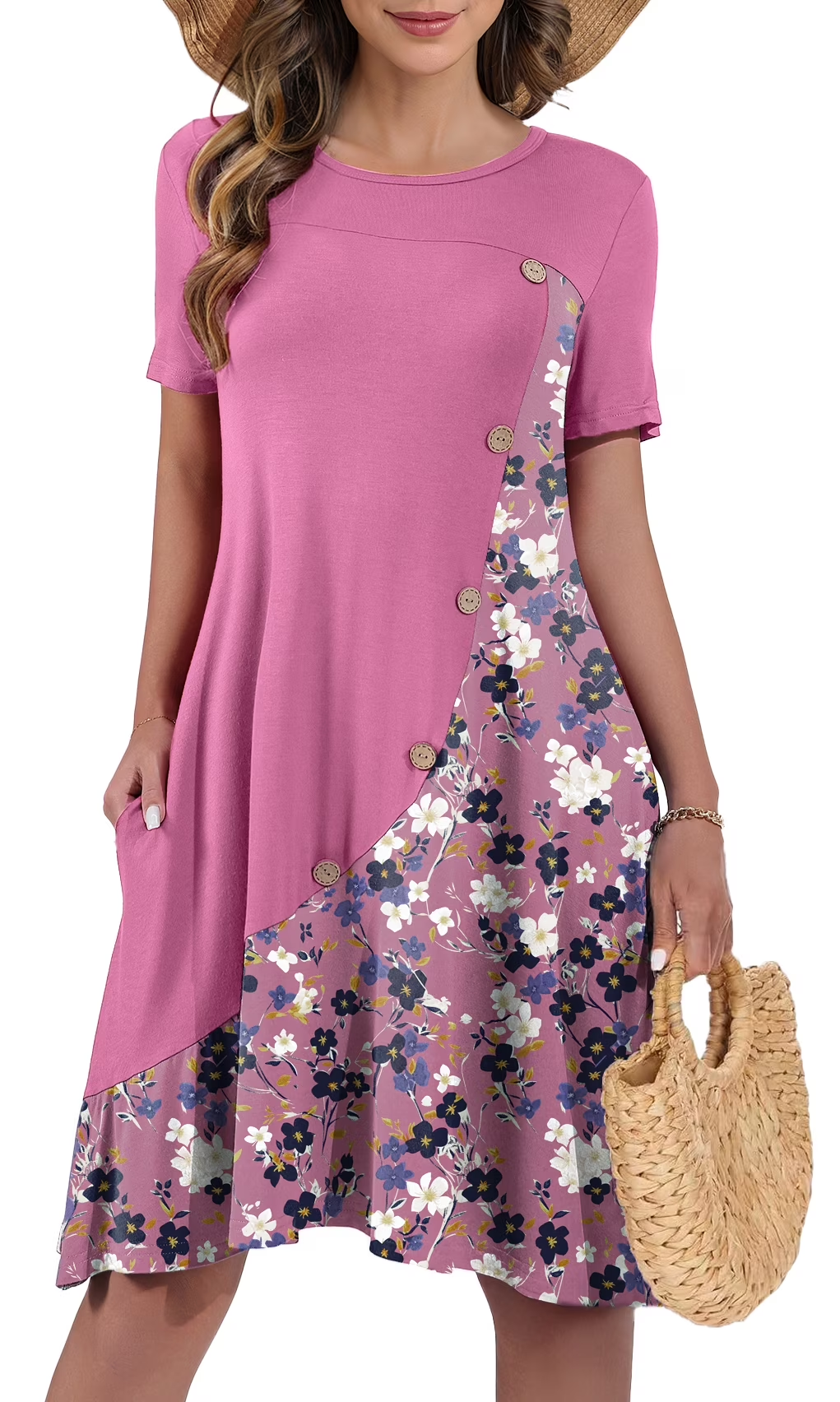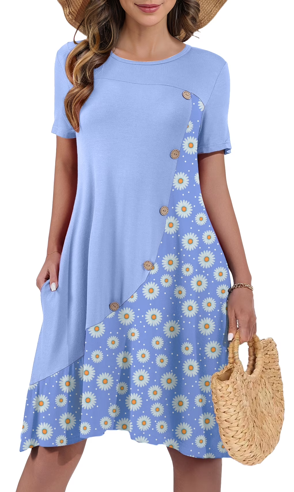 Elevate your wardrobe with this women’s short sleeve A-line dress, featuring a chic patchwork design that combines solid and floral patterns. The button accents and convenient side pockets offer both style and practicality. Crafted from soft, breathable fabric, this dress is perfect for casual outings, everyday wear, or relaxed occasions. A versatile piece that blends comfort and elegance effortlessly.