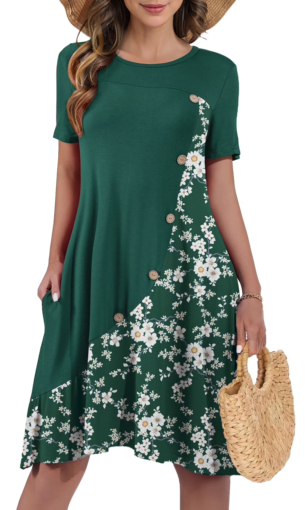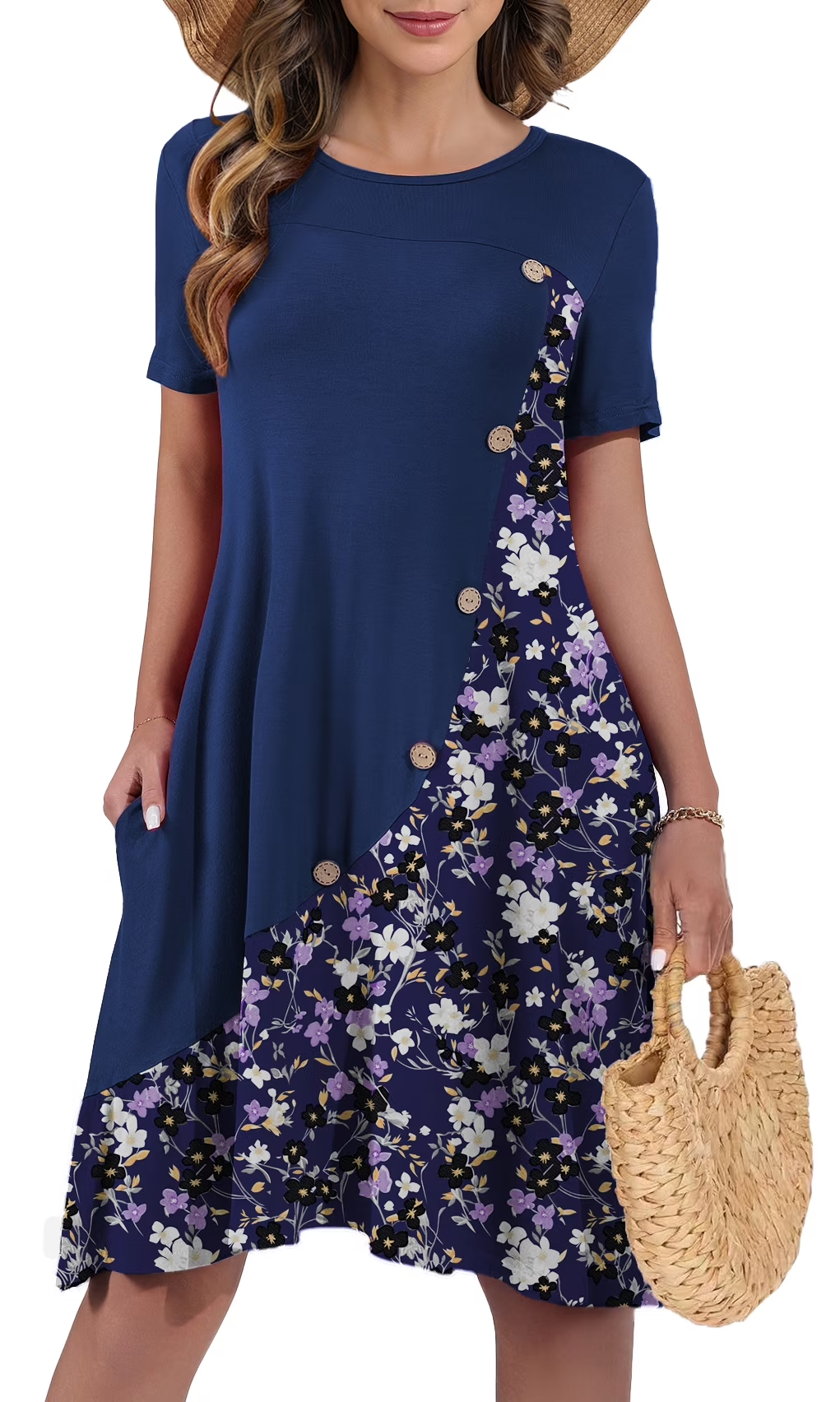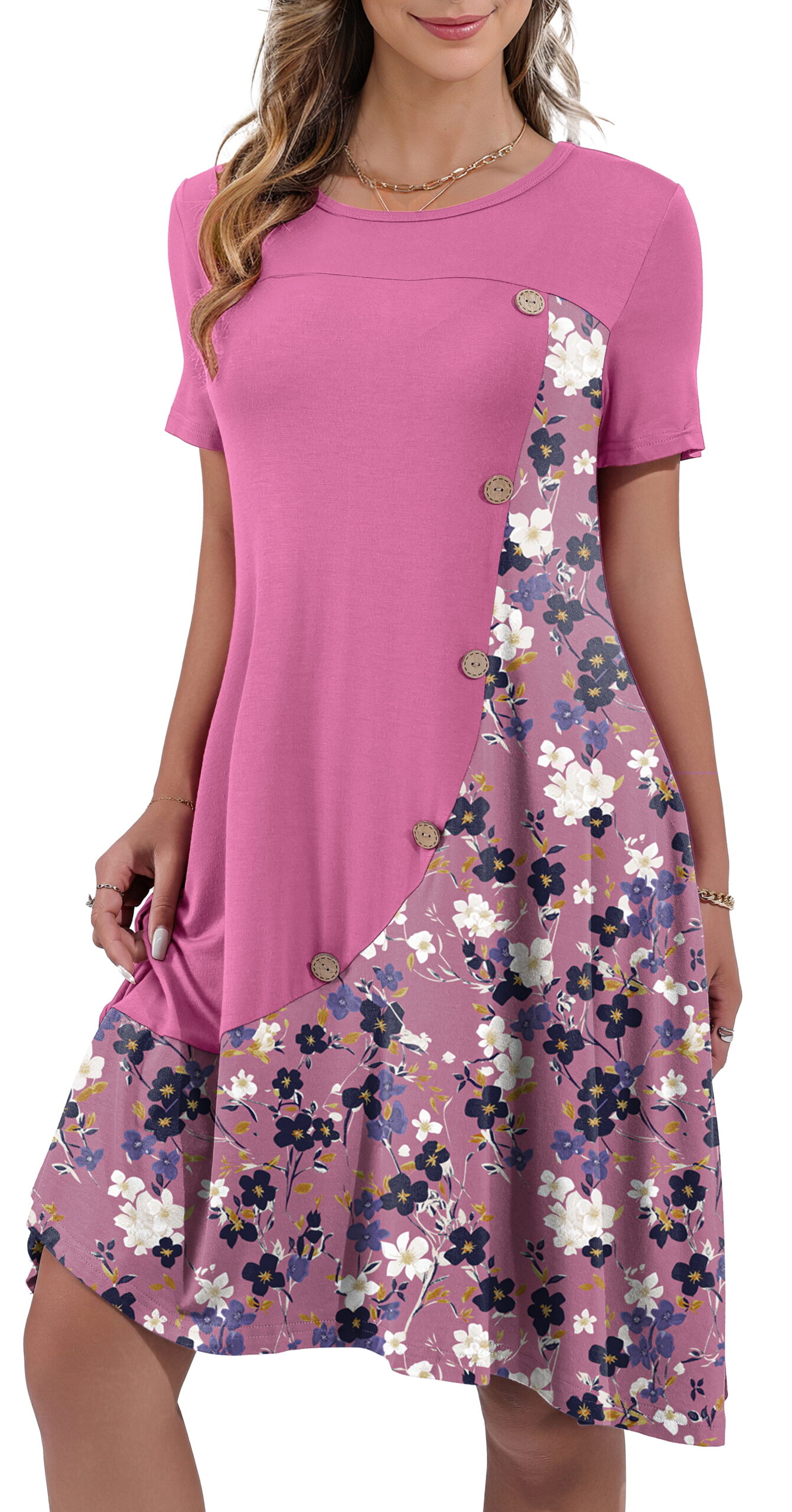 Elevate your wardrobe with this women’s short sleeve A-line dress, featuring a chic patchwork design that combines solid and floral patterns. The button accents and convenient side pockets offer both style and practicality. Crafted from soft, breathable fabric, this dress is perfect for casual outings, everyday wear, or relaxed occasions. A versatile piece that blends comfort and elegance effortlessly.