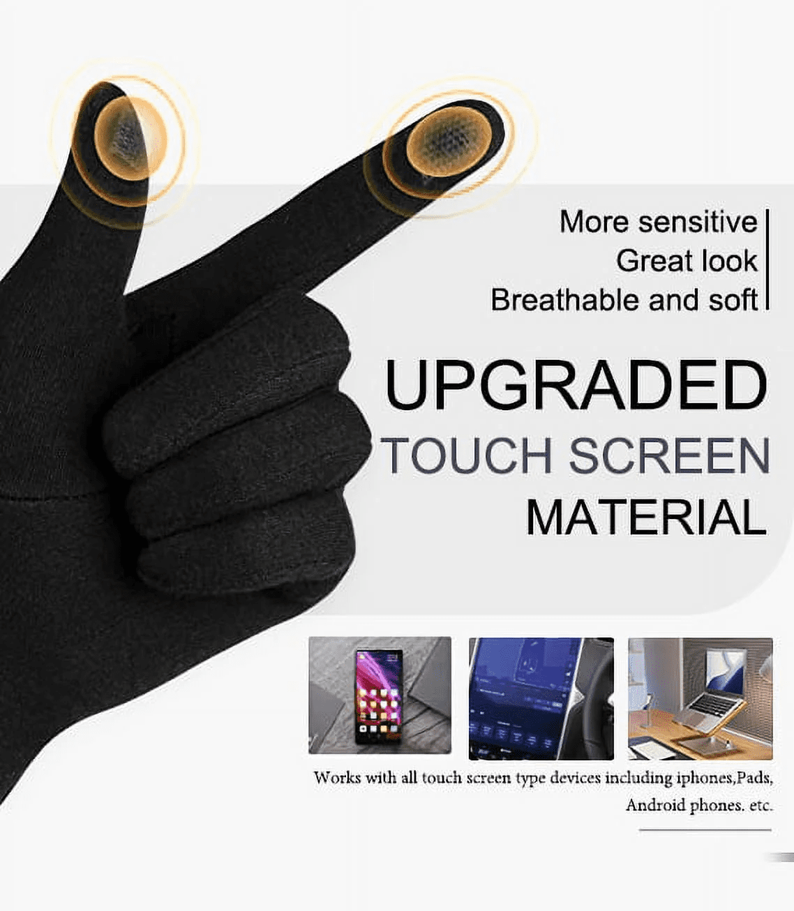 ●Upgraded Touch Screen Material: On the top of thumb and index finger, it is equipped with upgraded touch conductive material, more sensitive, great look, breathable and soft, it enables you to use the smartphone and touchscreen devices normally without having to take the gloves off.