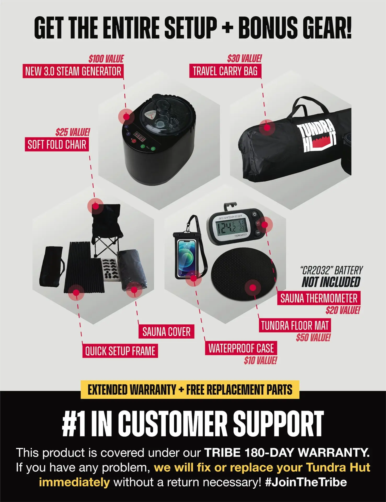 - Includes a premium Tribe Towel, thermometer, water-resistant phone case, bonus floor mat, and foldable chair